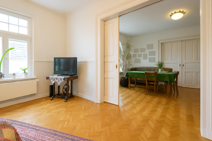 Über breite Schiebetüren ist das Wohnzimmer mit dem stilvollen Esszimmer verbunden. Diese Lösung ermöglicht sowohl ein offenes Wohnen als auch eine flexible Trennung der Räume. Das Esszimmer beeindruckt besonders durch das große, rundbogige Fenster, das dem Raum einen klassischen Altbaucharme verleiht. Hier findet ein großer Esstisch mühelos Platz – ideal für gesellige Abende oder Familienfeiern.