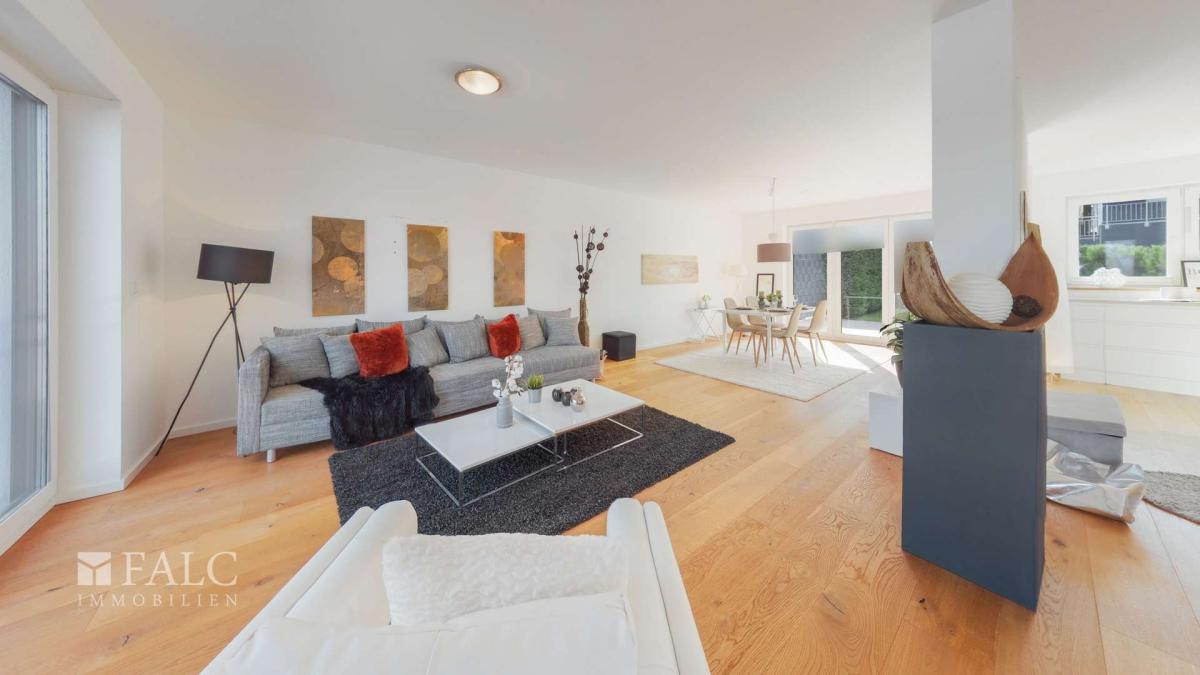 Bereits beim Betreten der Immobilie wird deutlich, dass hier besonderer Wert auf Offenheit, Licht und modernes Wohnen gelegt wurde. Durch die Hangbebauung befindet sich der zentrale Wohnbereich in der ersten Etage und bildet das Herzstück des Hauses. Diese Ebene beeindruckt durch einen großzügigen, offen gestalteten Wohn-, Ess- und Kochbereich, der nahezu die gesamte Etage einnimmt. Der weitläufige Grundriss schafft ein modernes Loft-Gefühl und bietet viel Raum für Wohnen, Leben und gesellige Stunden. Die offene Gestaltung verleiht dem Haus einen exklusiven und zugleich einladenden Charakter.