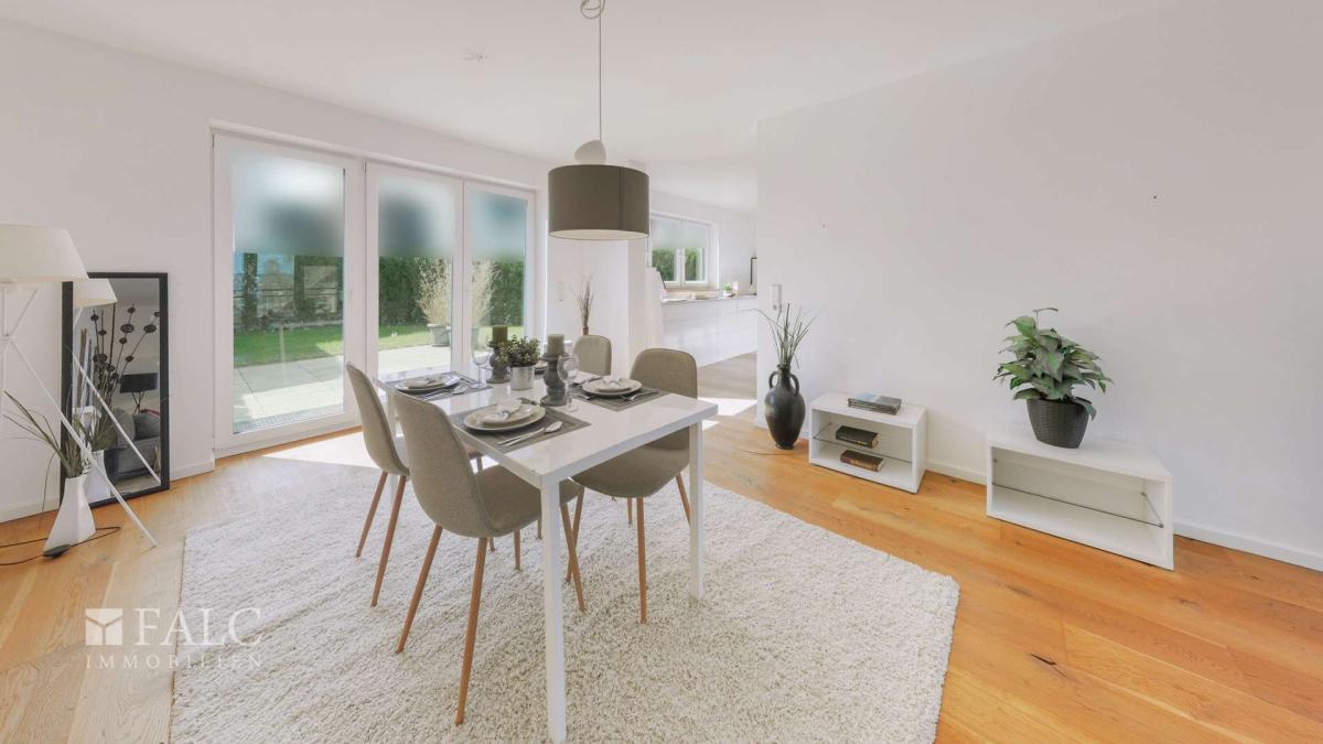 Besonders hervorzuheben sind die nahezu in allen Räumen vorhandenen bodentiefen Fenster, die für ein helles und freundliches Wohnambiente sorgen. Dadurch wirken die Räume zu jeder Tageszeit besonders lichtdurchflutet und einladend.