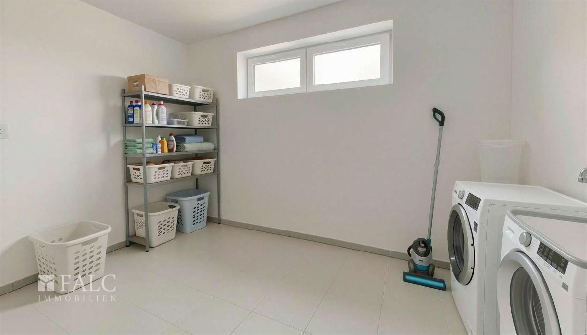 Im Eingangsbereich des Hauses stehen zusätzlich ein weiteres Zimmer, das sich ideal als Gästezimmer oder Büro eignet, ein Hauswirtschaftsraum, ein weiteres Badezimmer mit Dusche sowie der Technikraum zur Verfügung. Von hier besteht außerdem ein direkter Zugang zur Garage, was zusätzlichen Komfort im Alltag bietet.