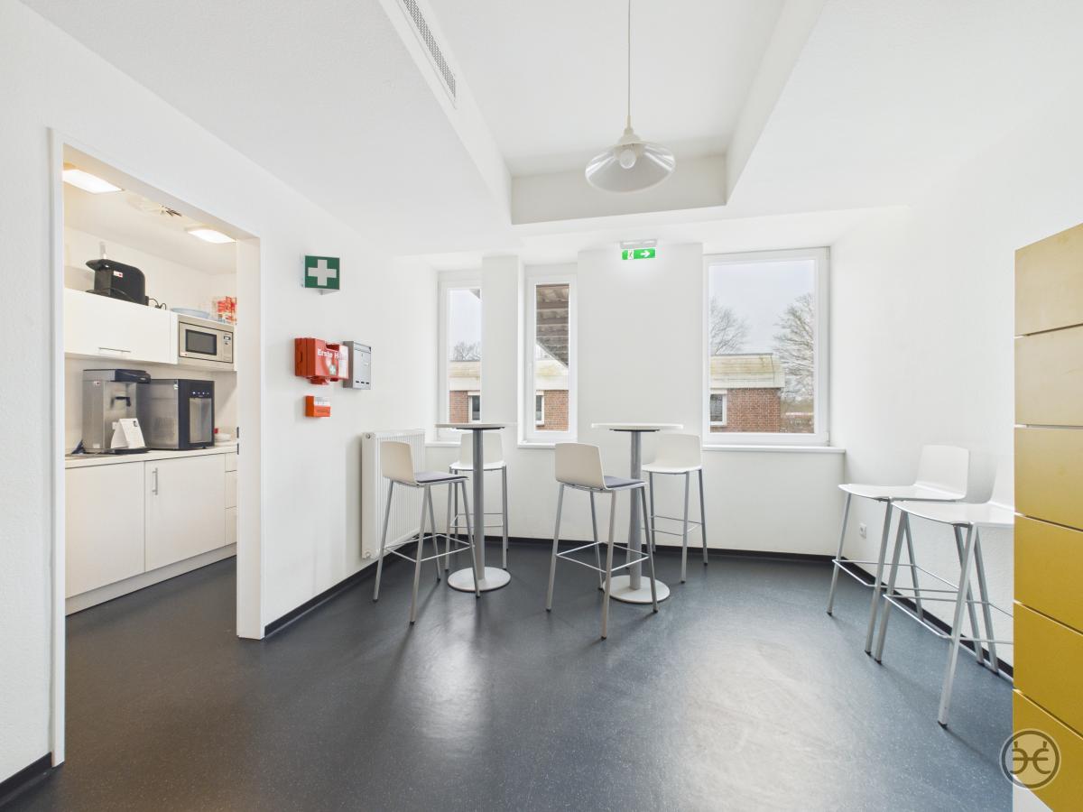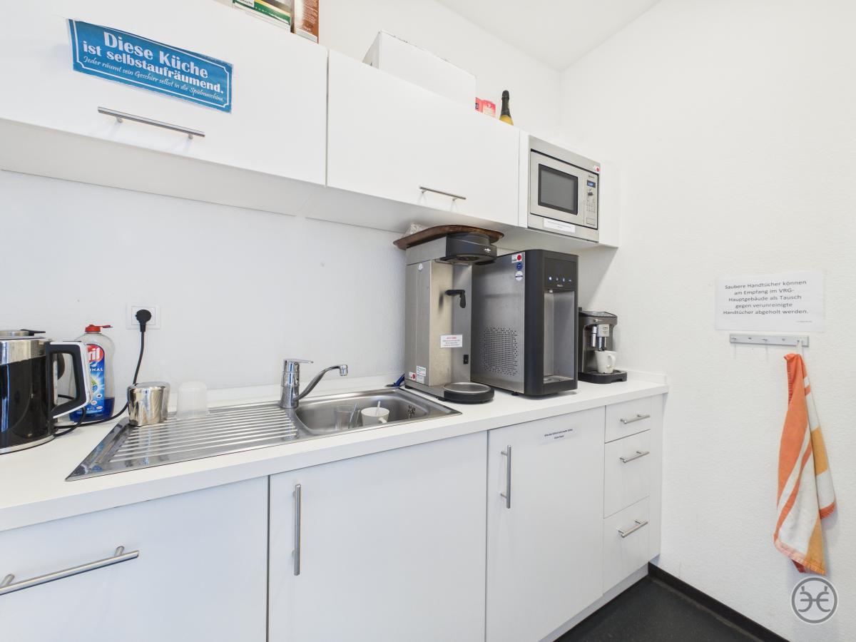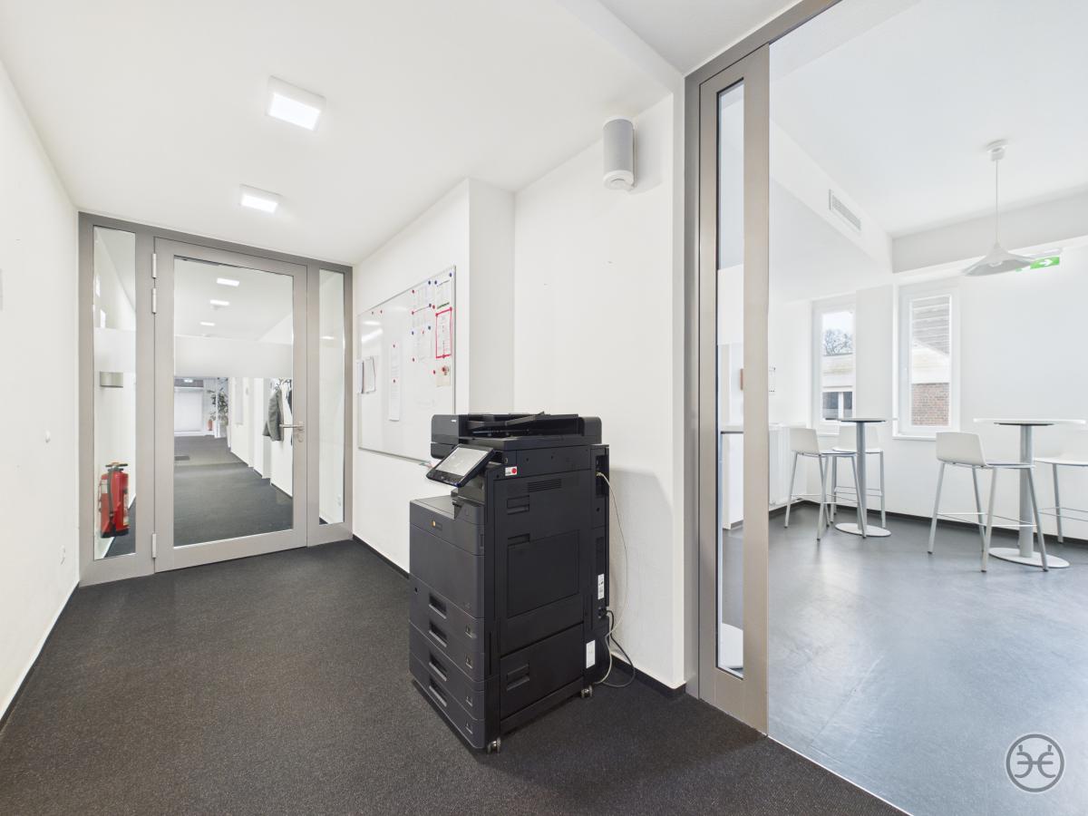 Über das Treppenhaus erreichen Sie dann die erste Büroetage. Im Eingangsbereich finden Sie hier zunächst den Sozialraum mit kleinem Küchenbereich und separatem Abstellraum. Dieser Bereich ist für die einfachere Reinigung mit einem Linoleum-Boden ausgelegt. Die gezeigte Einbauküche/Pantry ist in unserem Mietangebot enthalten. Gegenüberliegend befindet sich die Etagen WCs, die ansprechend ausgestattet und mit Boden- und Wandfliesen versehen wurden. Es stehen hier drei Kabinen und ein Vorraum mit Waschtisch, Spiegel & Co zur Verfügung. In diesem Objekt ist es so gelöst, das sich auf einer Etage Die Herren und auf der anderen Etage die Damen WCs befinden! Sollten Sie noch nicht komplett papierlos arbeiten würde im Eingangsbereich auch noch ein Kopierer im Flur seinen Platz finden.