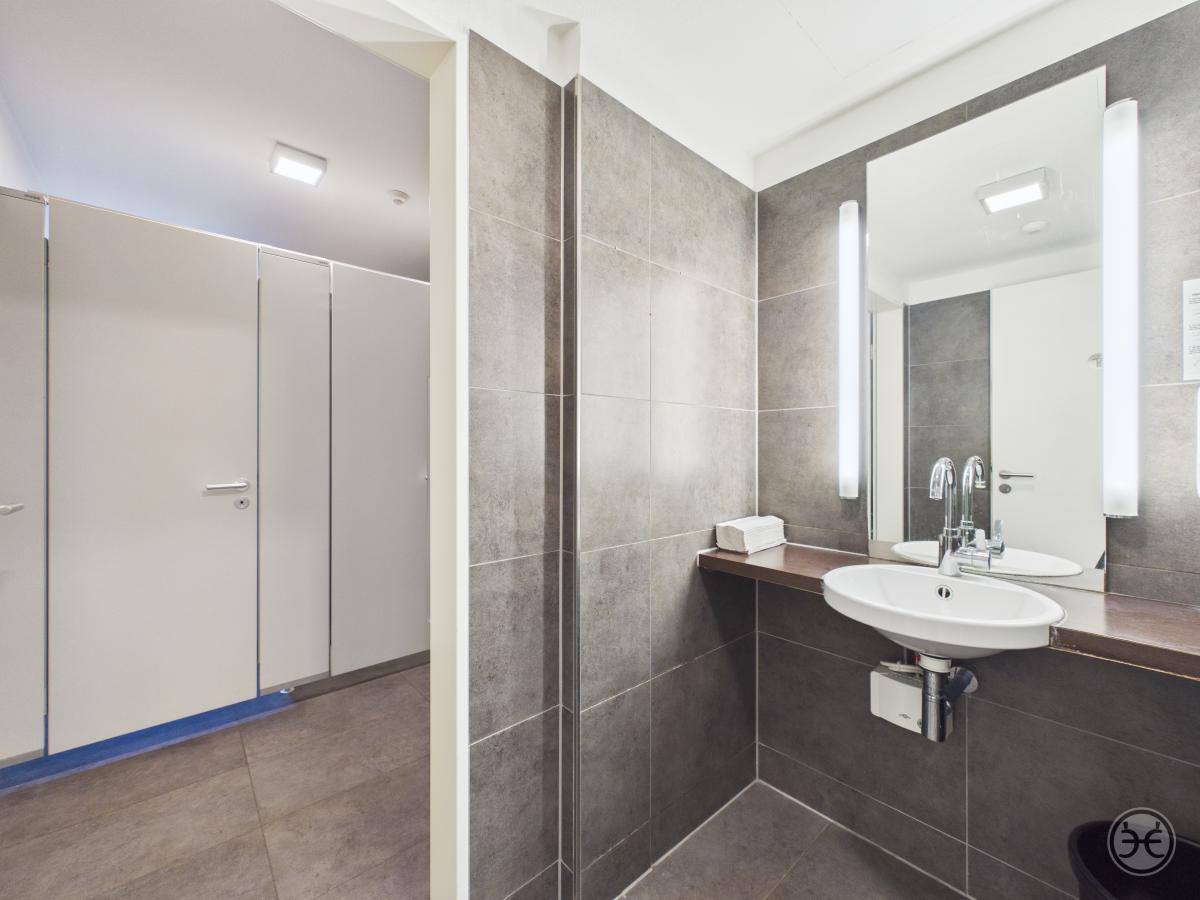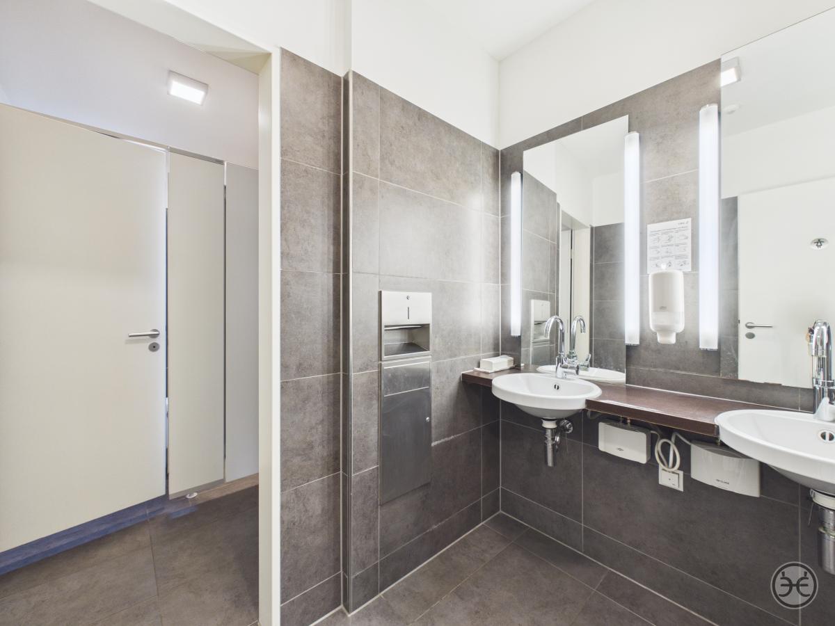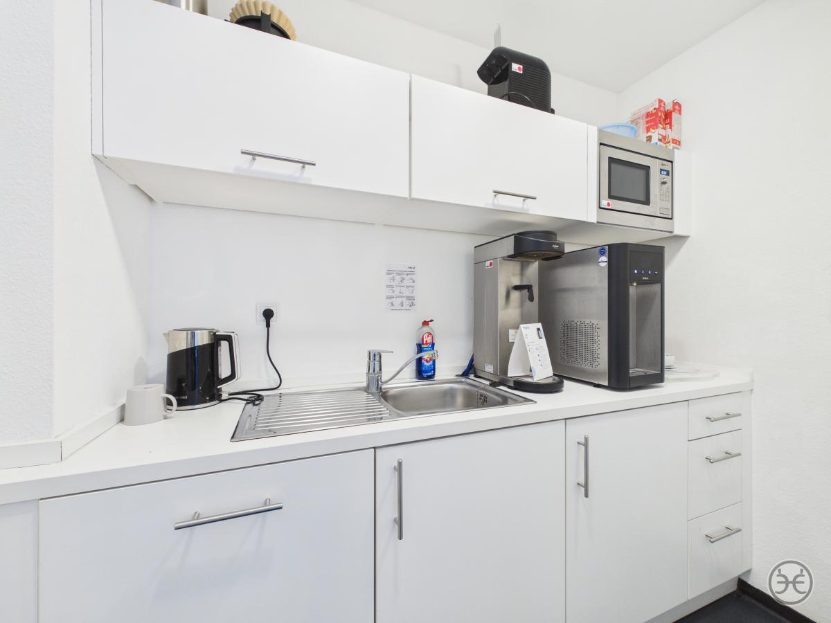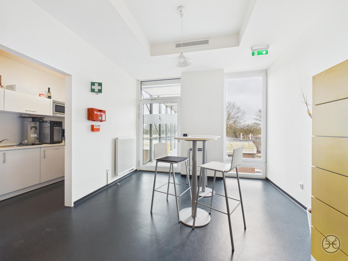Über das Treppenhaus erreichen Sie dann die erste Büroetage. Im Eingangsbereich finden Sie hier zunächst den Sozialraum mit kleinem Küchenbereich und separatem Abstellraum. Dieser Bereich ist für die einfachere Reinigung mit einem Linoleum-Boden ausgelegt. Die gezeigte Einbauküche/Pantry ist in unserem Mietangebot enthalten. Gegenüberliegend befindet sich die Etagen WCs, die ansprechend ausgestattet und mit Boden- und Wandfliesen versehen wurden. Es stehen hier drei Kabinen und ein Vorraum mit Waschtisch, Spiegel & Co zur Verfügung. In diesem Objekt ist es so gelöst, das sich auf einer Etage Die Herren und auf der anderen Etage die Damen WCs befinden! Sollten Sie noch nicht komplett papierlos arbeiten würde im Eingangsbereich auch noch ein Kopierer im Flur seinen Platz finden.