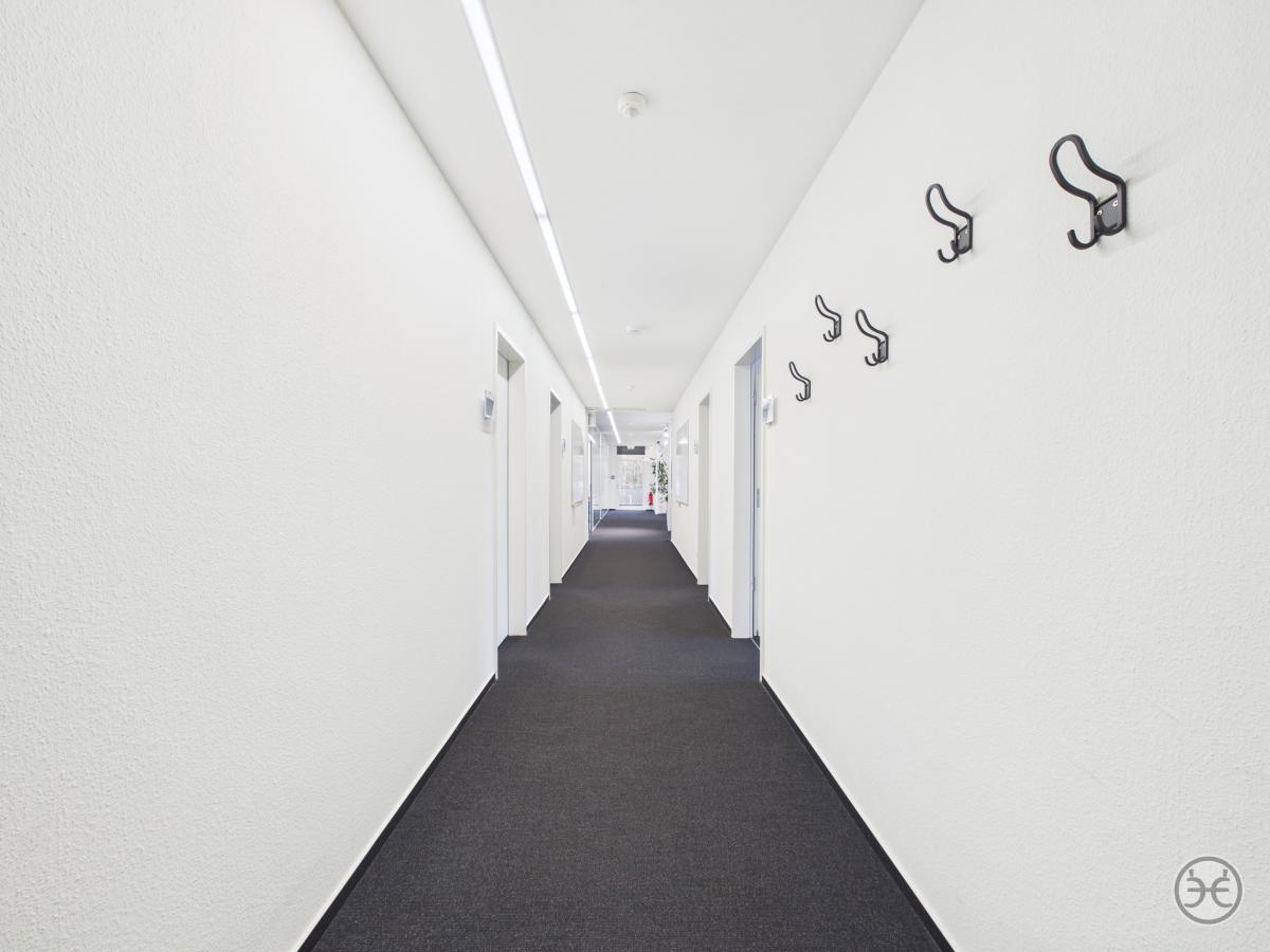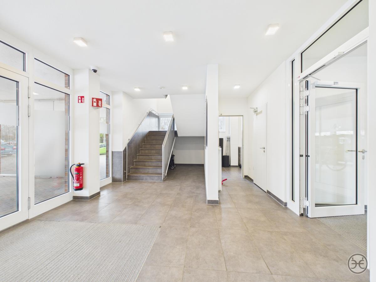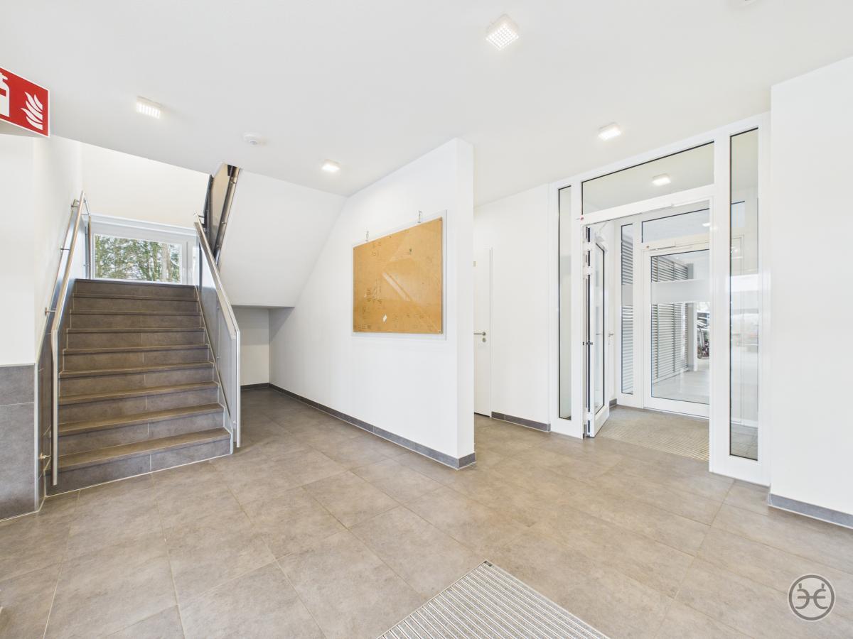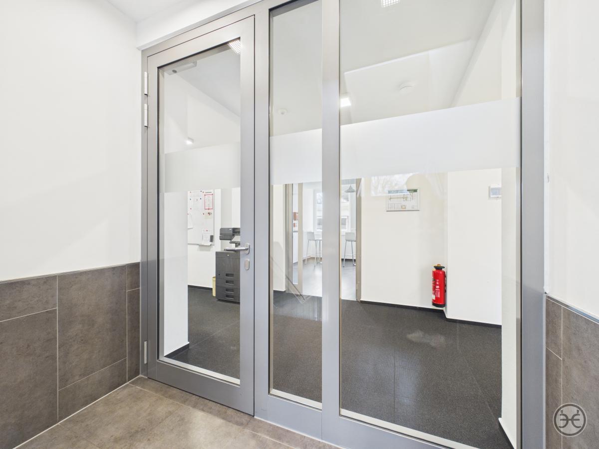 Sie erreichen die Büroetagen über den zentralen Eingang im Erdgeschoss. Im gefliesten Eingangsbereich finden Sie einen größeren Abstellraum, der für Putzmittel oder als Lagerraum genutzt werden kann. Die Zugänge sind mit Sauberlauf-Matten ausgestattet.