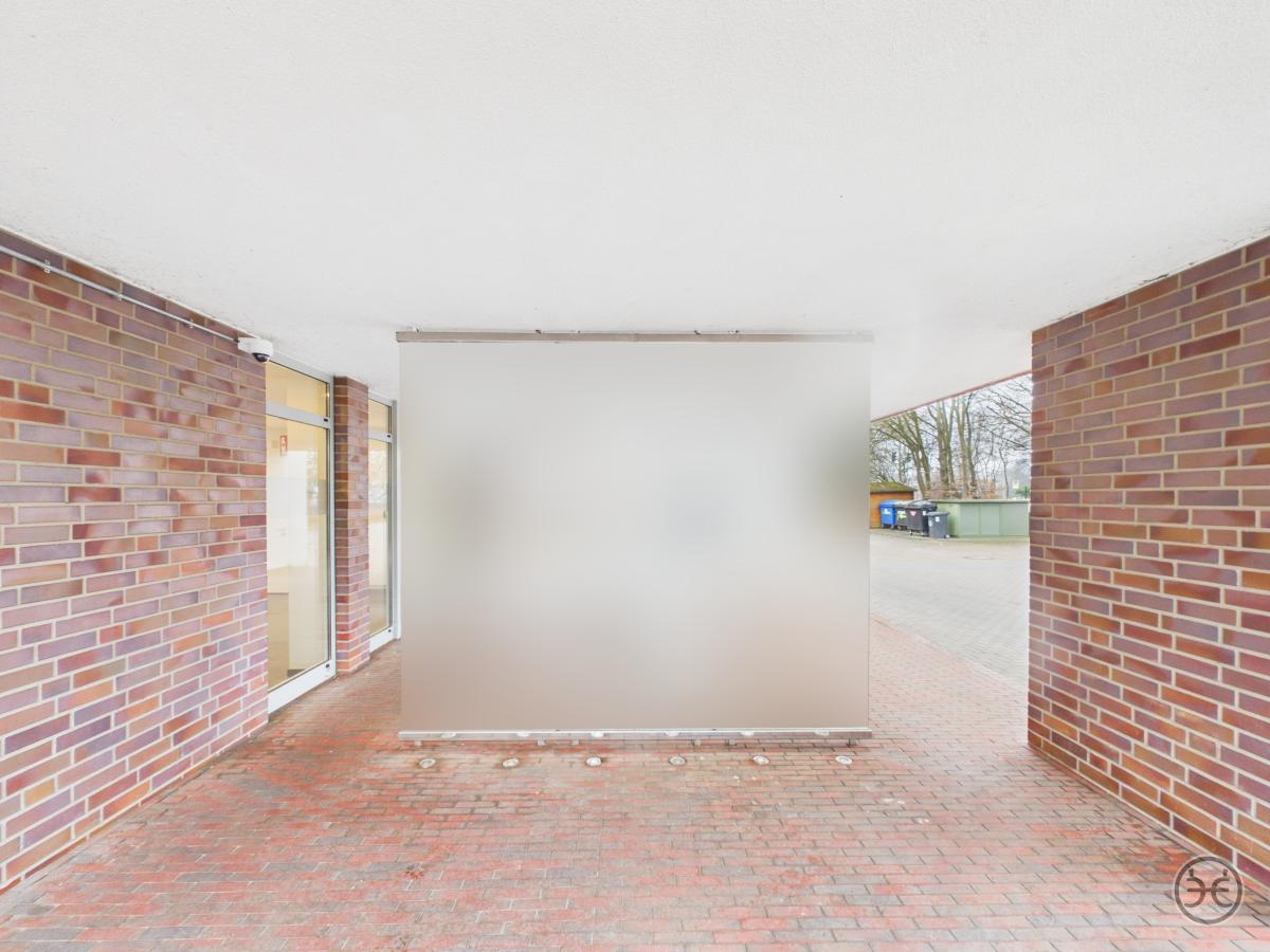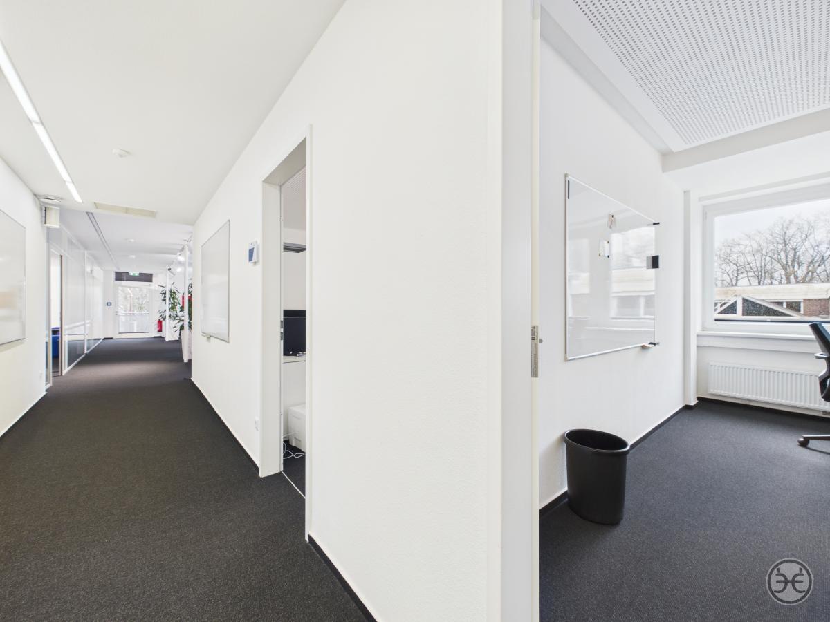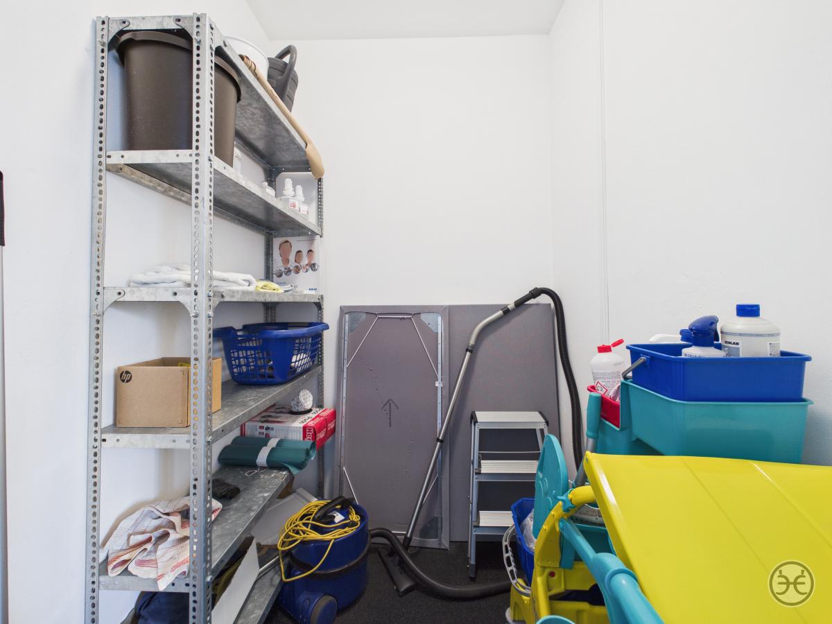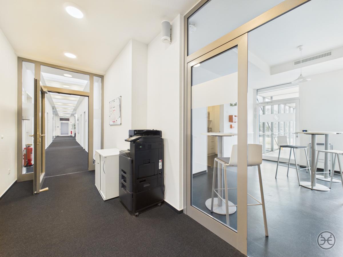 Sie erreichen die Büroetagen über den zentralen Eingang im Erdgeschoss. Im gefliesten Eingangsbereich finden Sie einen größeren Abstellraum, der für Putzmittel oder als Lagerraum genutzt werden kann. Die Zugänge sind mit Sauberlauf-Matten ausgestattet.