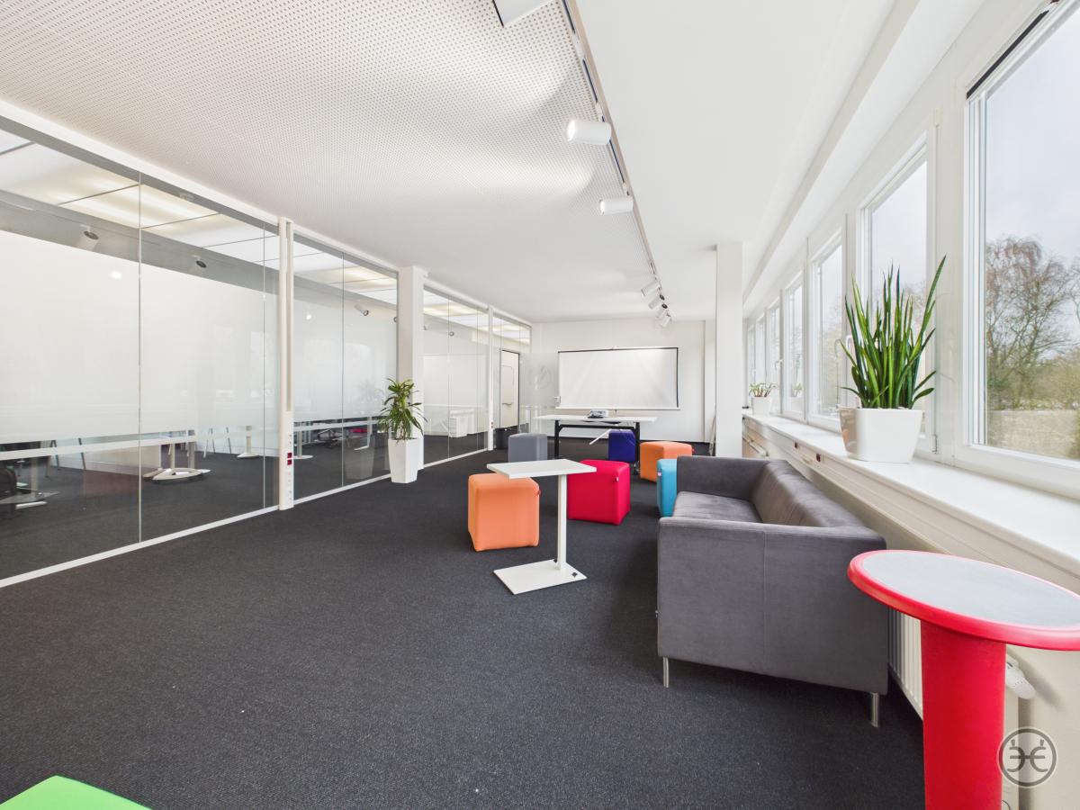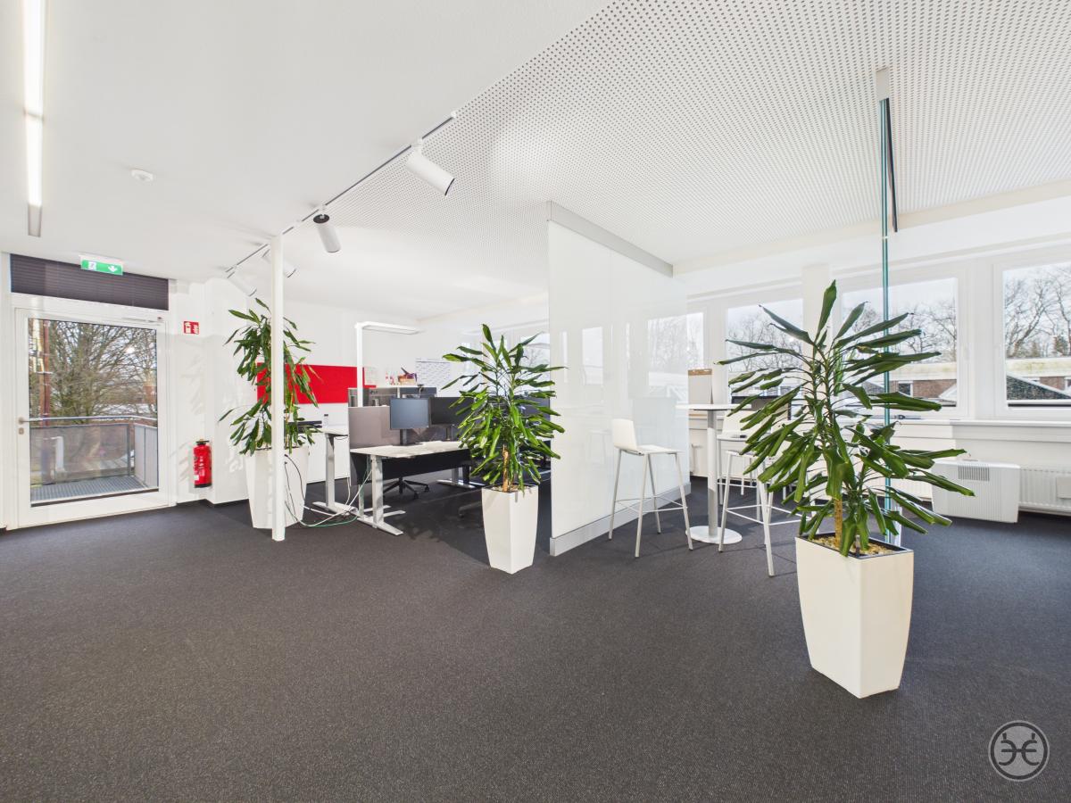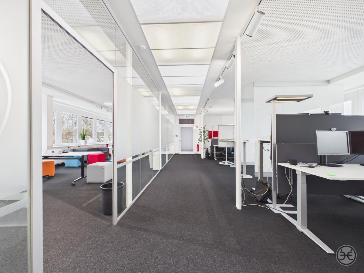 Auf der gegenüberliegenden Seite wurde ein ca. 55 m² großer und ebenso offen gestalteter Arbeitsbereich geschaffen, der entgegen den anderen Räumen mit modernen Glas-Trennwänden abgetrennt wurde. Dies sorgt zum einen für eine bessere Belichtung der Flächen aber auch für eine gewisse Offenheit, ohne die Teams im offenen Bereich zu stören. Dieser Bereich kann sowohl für Besprechungen und Präsentation, weiterer Team-Bereich oder auch als normaler Arbeitsbereich genutzt werden. Auch dieser Bereich verfügt über eine Vielzahl von Deckenspots für eine individuelle Ausleuchtung.