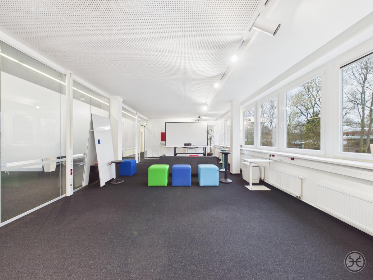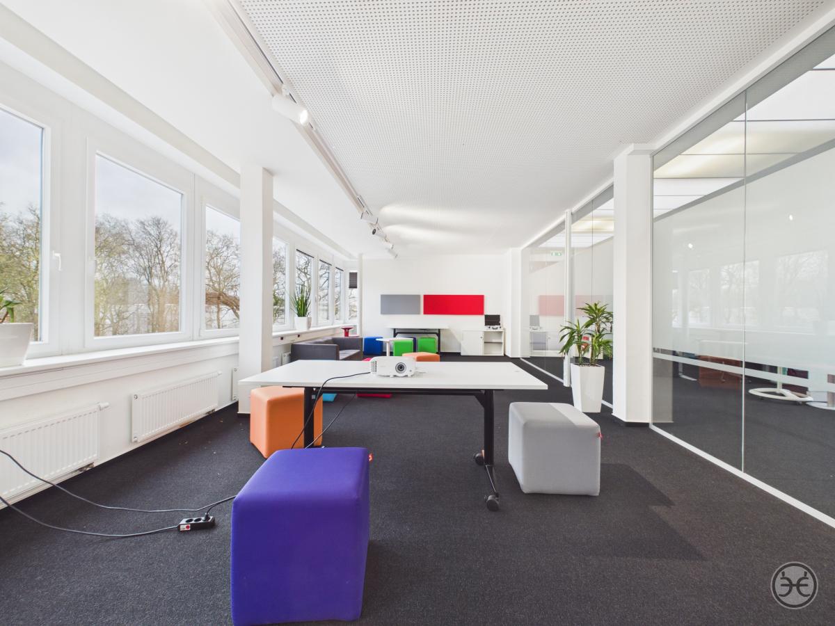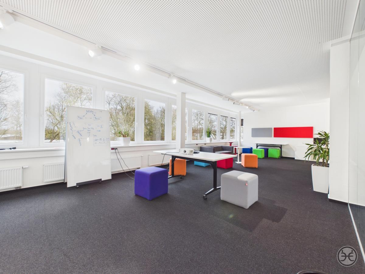 Auf der gegenüberliegenden Seite wurde ein ca. 55 m² großer und ebenso offen gestalteter Arbeitsbereich geschaffen, der entgegen den anderen Räumen mit modernen Glas-Trennwänden abgetrennt wurde. Dies sorgt zum einen für eine bessere Belichtung der Flächen aber auch für eine gewisse Offenheit, ohne die Teams im offenen Bereich zu stören. Dieser Bereich kann sowohl für Besprechungen und Präsentation, weiterer Team-Bereich oder auch als normaler Arbeitsbereich genutzt werden. Auch dieser Bereich verfügt über eine Vielzahl von Deckenspots für eine individuelle Ausleuchtung.
