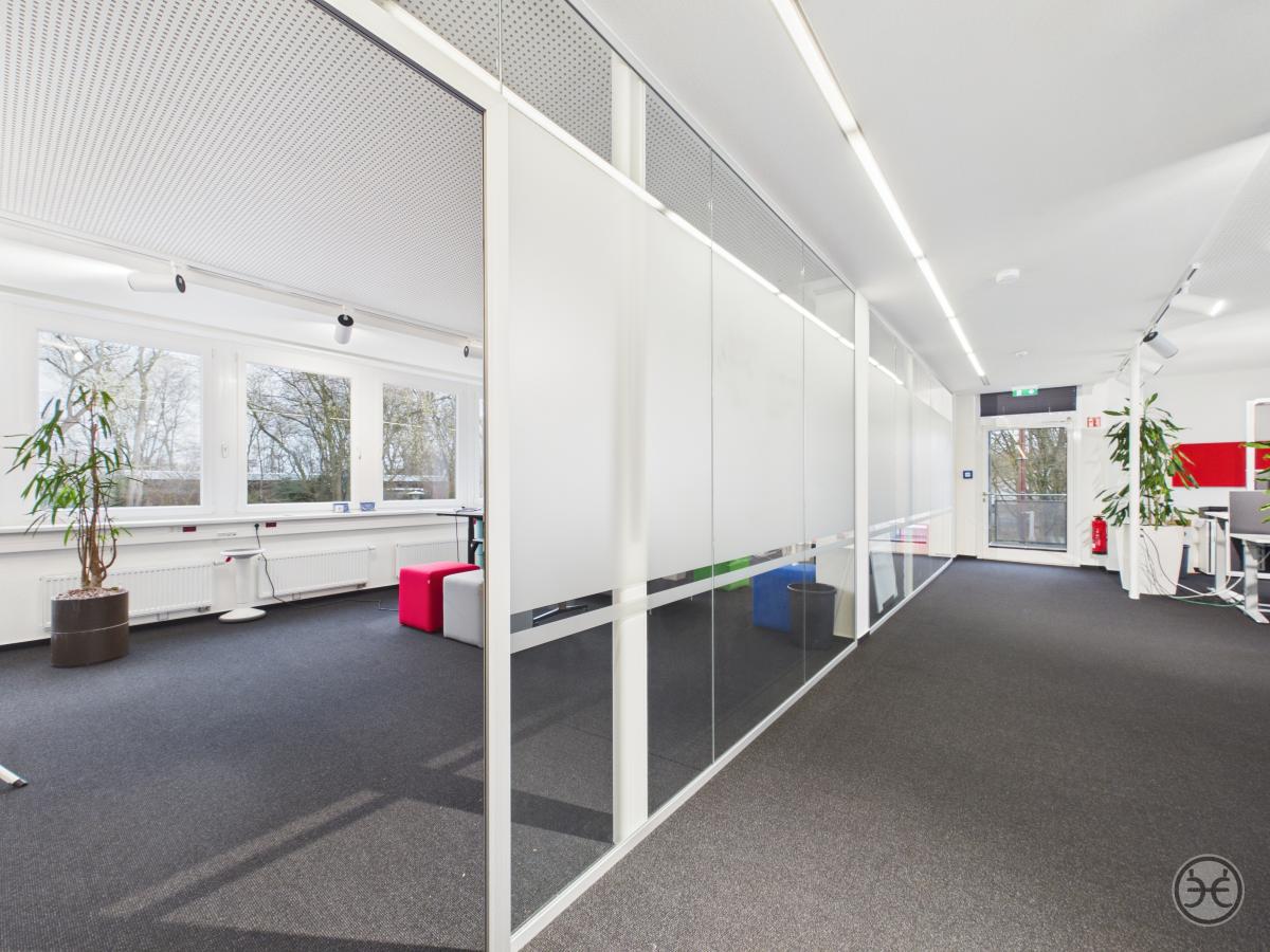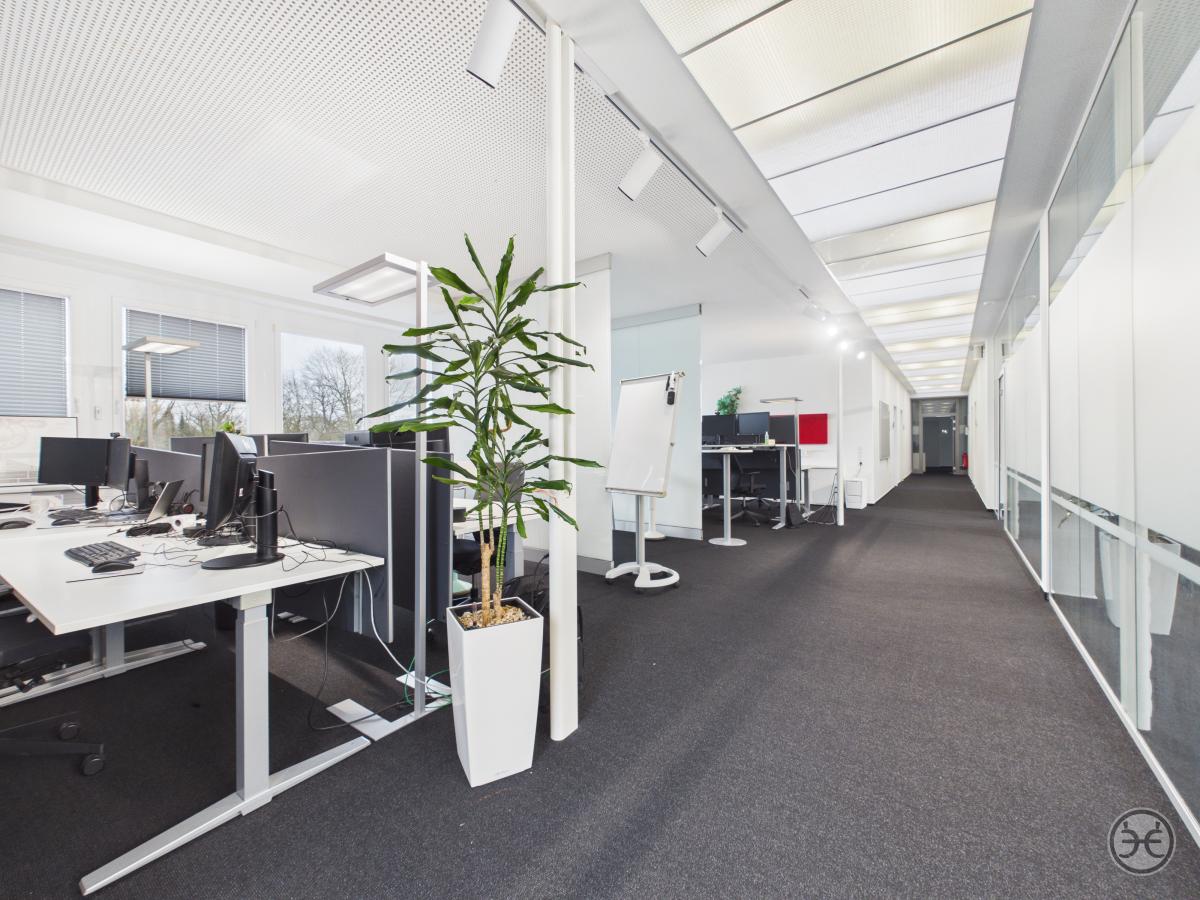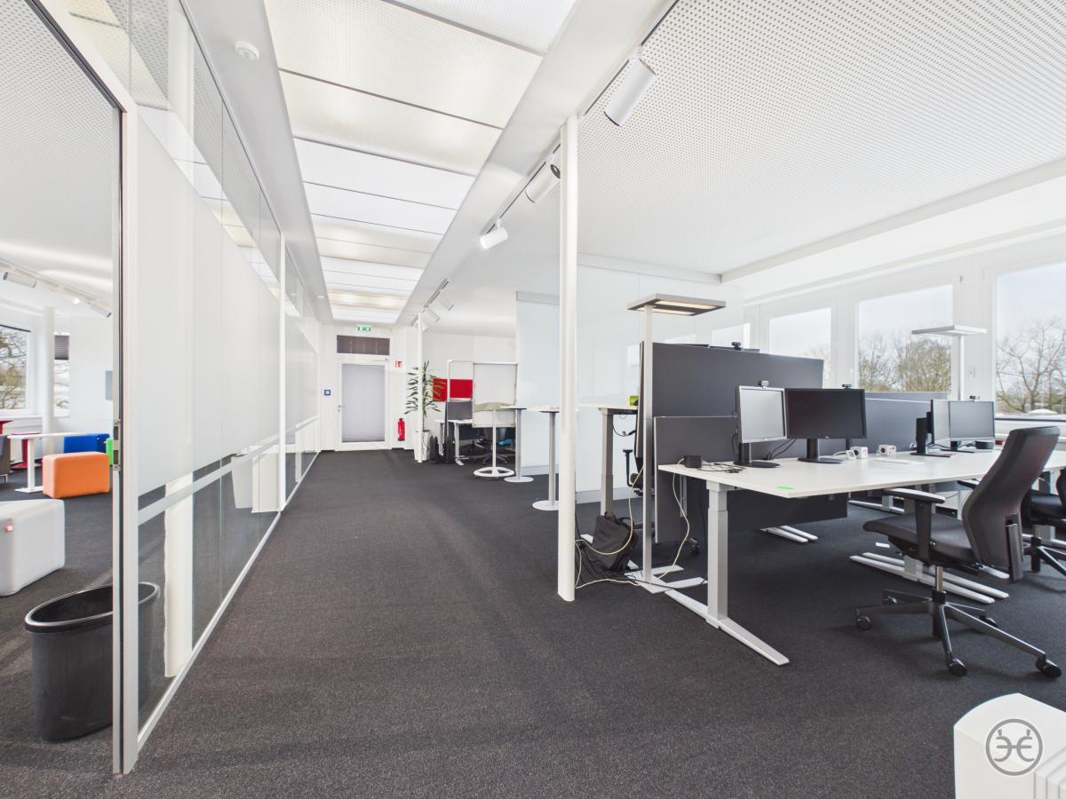 Die zweite Büroetage ist im Prinzip genauso gestaltet, wie die erste Etage. Ausnahme ist hier z.B. dass die beiden "Kopf-Büros" im westlichen Teil mit einer mobilen Trennwand ausgestattet sind, so dass auch hier bei Bedarf ein großer und zusammenhängender Bereich geschaffen werden kann. So sind Sie über die Gesamtflächen möglichst flexibel, um die Räume an Ihre Bedarfe anzupassen. Weiterer Unterschied sind die zusätzlichen Lichtkuppeln im hinteren Flurbereich, die hier auch von oben für einen angenehmen Tageslichteinfall sorgen.