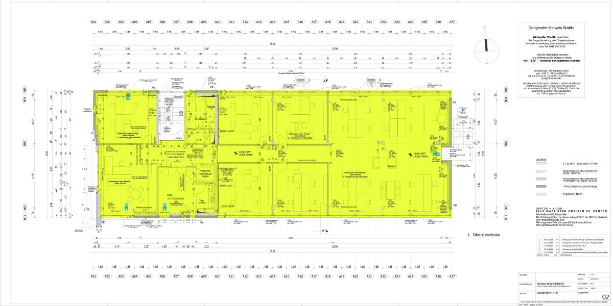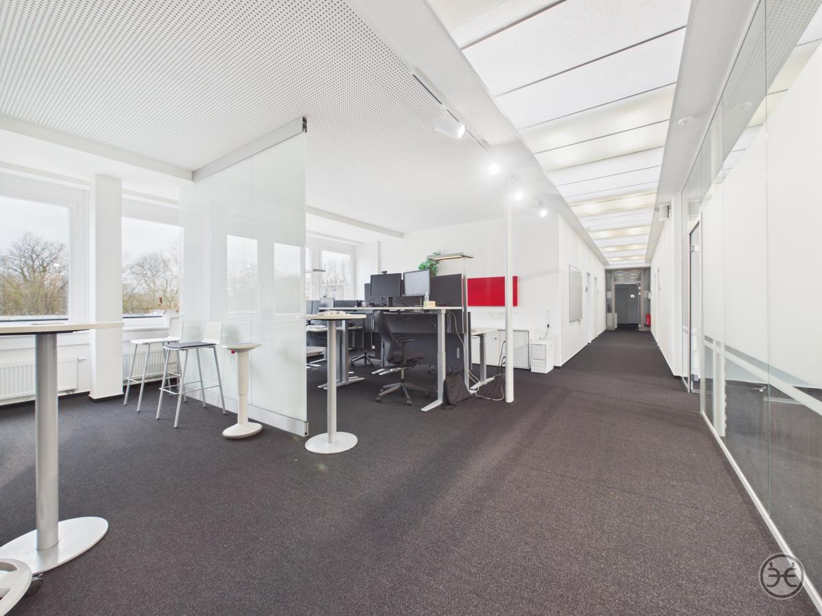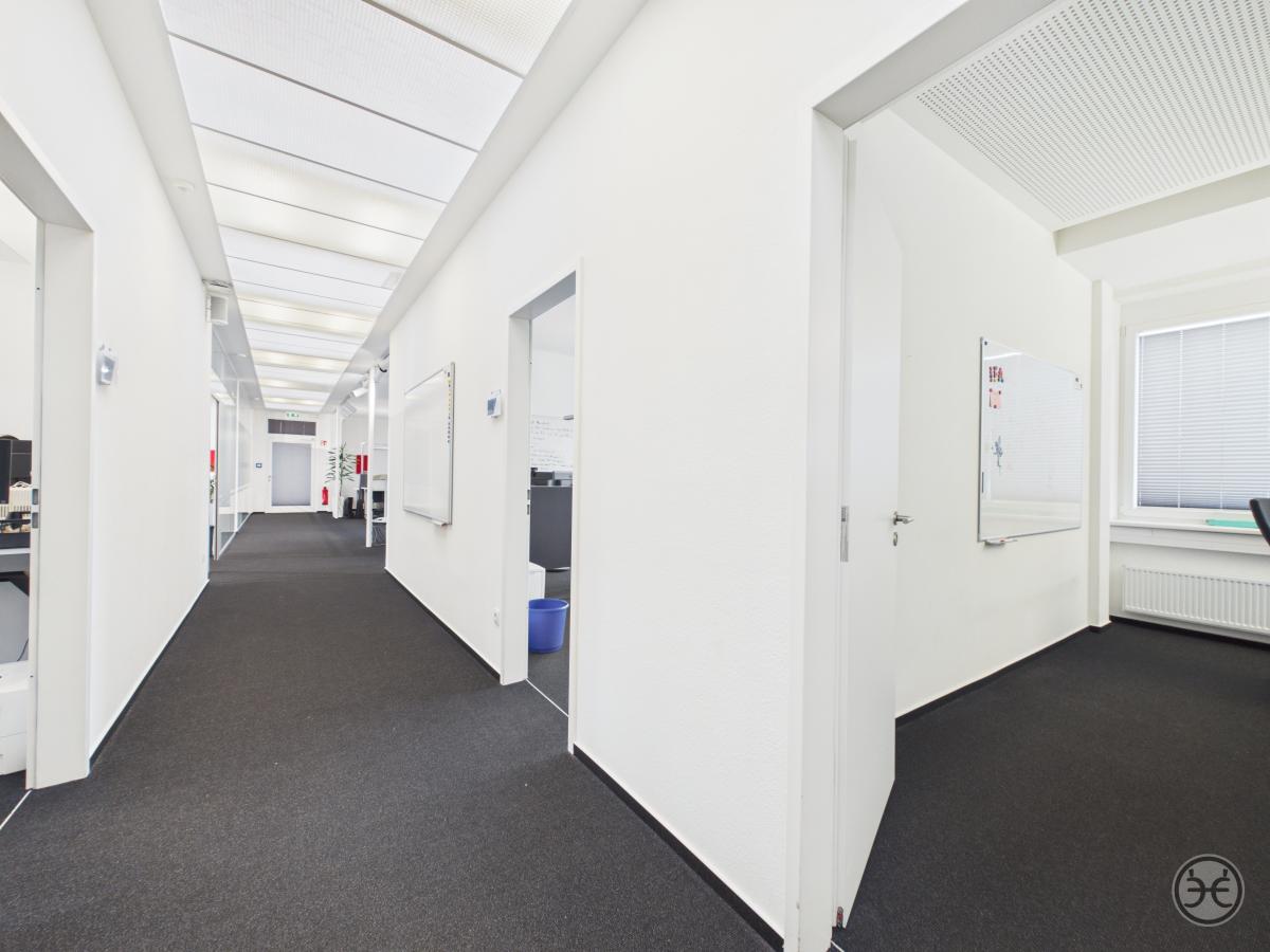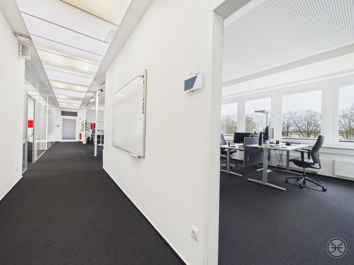 Die zweite Büroetage ist im Prinzip genauso gestaltet, wie die erste Etage. Ausnahme ist hier z.B. dass die beiden "Kopf-Büros" im westlichen Teil mit einer mobilen Trennwand ausgestattet sind, so dass auch hier bei Bedarf ein großer und zusammenhängender Bereich geschaffen werden kann. So sind Sie über die Gesamtflächen möglichst flexibel, um die Räume an Ihre Bedarfe anzupassen. Weiterer Unterschied sind die zusätzlichen Lichtkuppeln im hinteren Flurbereich, die hier auch von oben für einen angenehmen Tageslichteinfall sorgen.