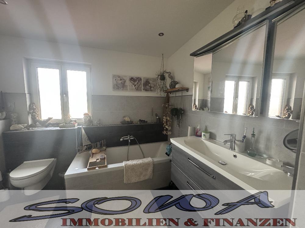 Das Badezimmer verfügt über eine großzügige Dusche, Badewanne, Handtuchwärmer, Tageslicht/Fenster und WC sowie eine Fußbodenheizung.