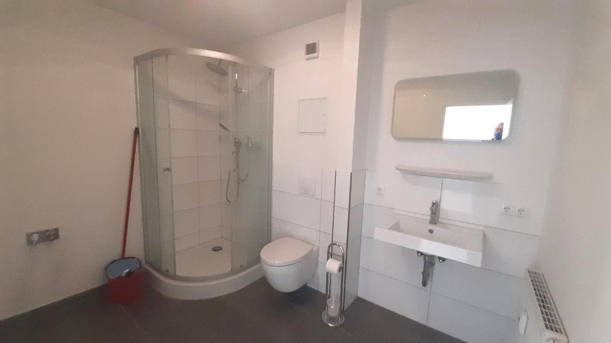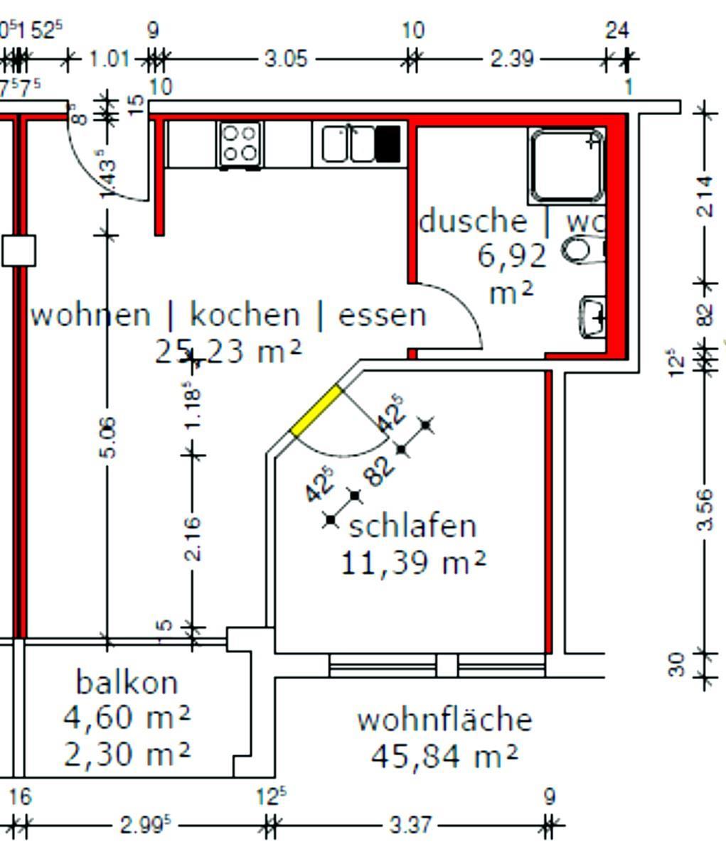 Die Wohnung verfügt bei ca. 45 m² Wohnfläche über Wohnzimmer mit offener Küche und Balkon, Schlafzimmer, sep. WC, Duschbad.