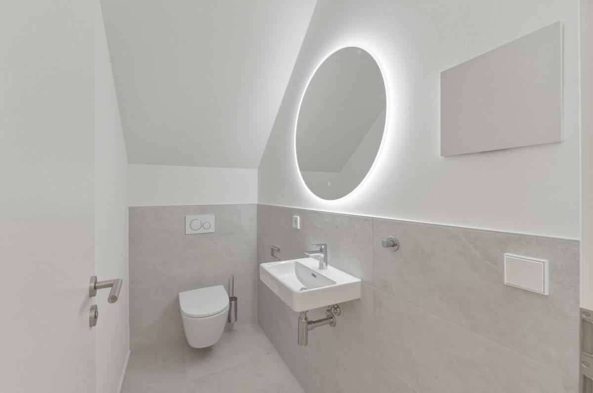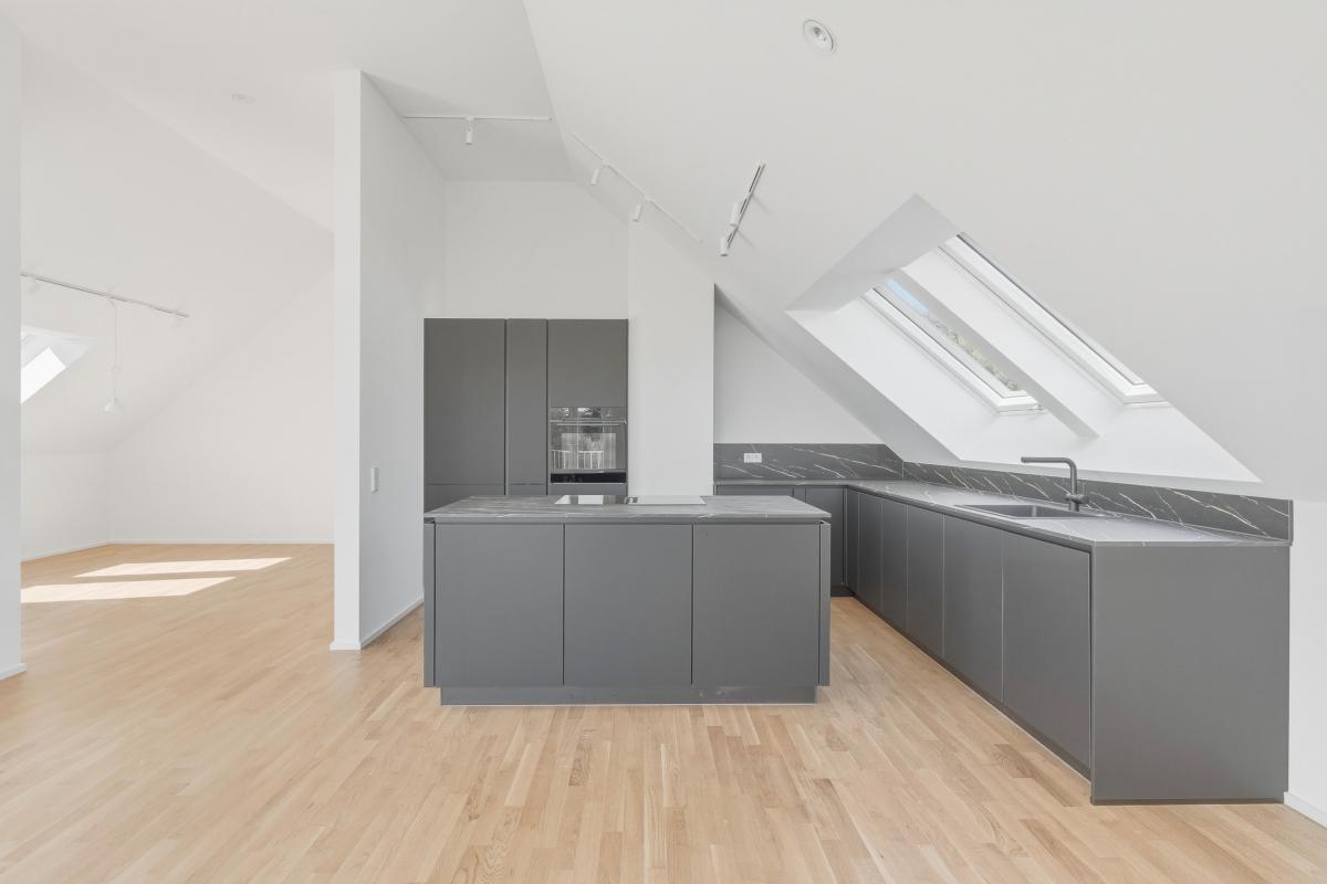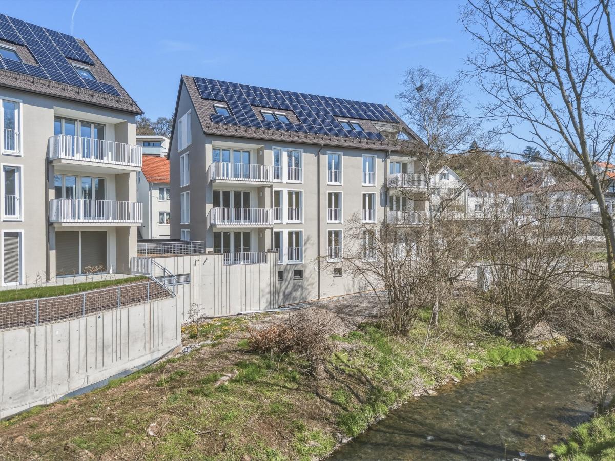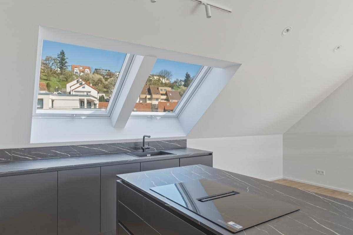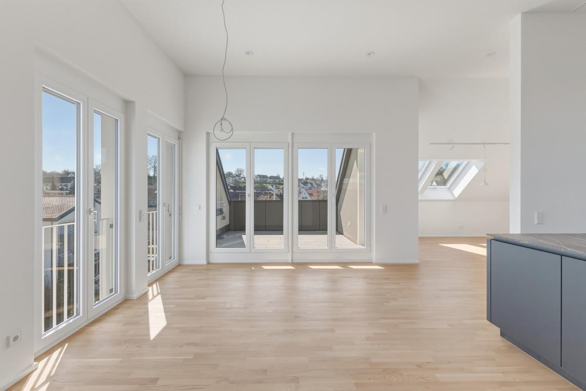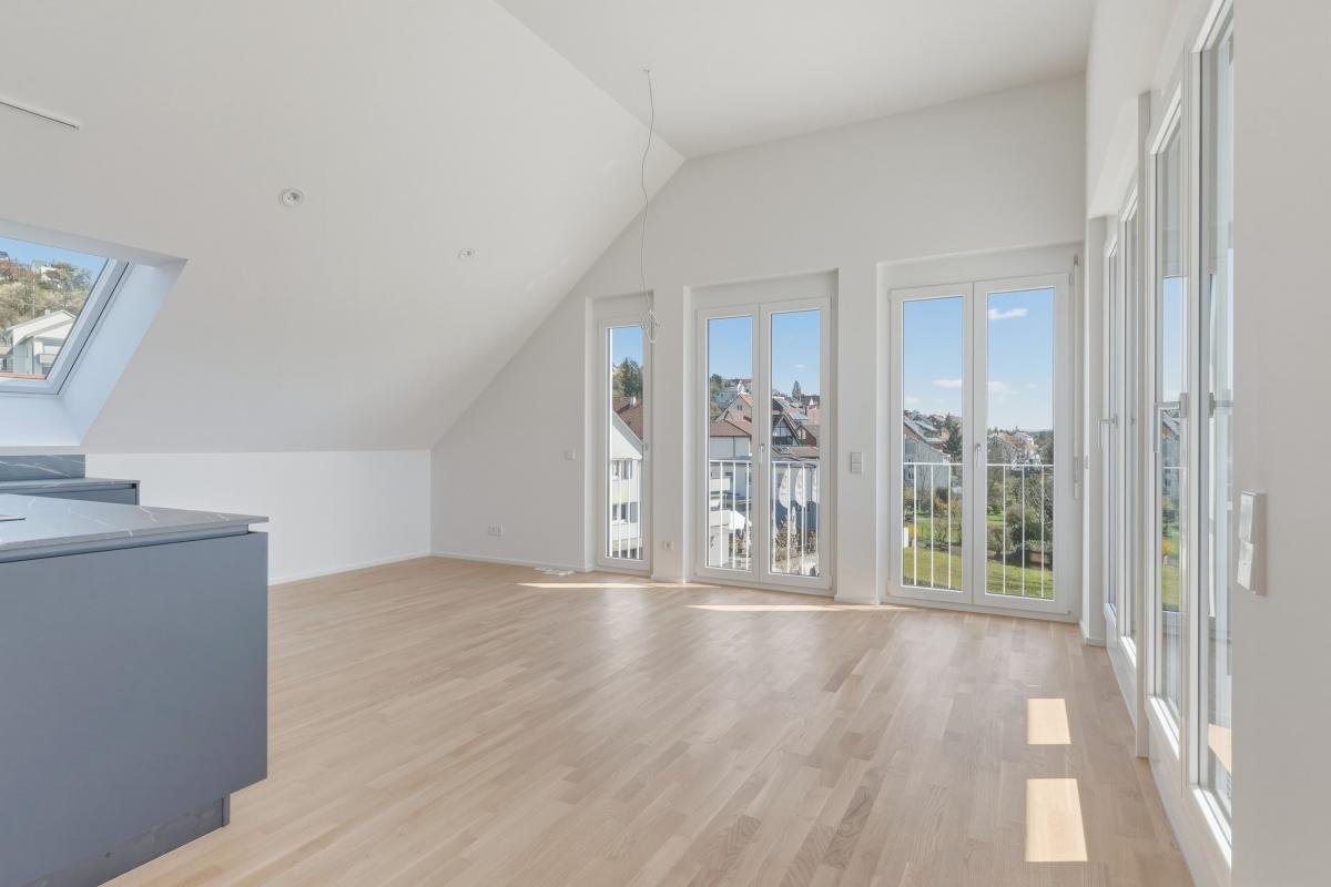 Diese moderne Dachgeschoss-Wohnung wird erstmals nach Fertigstellung eines hochwertigen Neubaus vermietet und überzeugt durch eine klare Raumaufteilung sowie helle, freundliche Wohnräume. Der offen gestaltete Wohn- und Essbereich mit großer Fensterfront schafft ein angenehmes Raumgefühl und bietet direkten Zugang zum Balkon. In den Wohn- und Schlafräumen ist hochwertiges Eiche-Echtholzparkett im Schiffsbodendesign verlegt. Eine Fußbodenheizung sorgt in allen Räumen für behaglichen Wohnkomfort. Elektrische Rollläden im Wohnbereich sowie dreifach verglaste Fenster tragen zusätzlich zu Ruhe und Wohnqualität bei. Die Wohnung ist mit einer hochwertigen Einbauküche ausgestattet, die moderne Bosch-Elektrogeräte umfasst und ist wie ansprechende Deckenleuchten bereits im Mietangebot enthalten. Das Badezimmer präsentiert sich zeitlos und hochwertig mit großformatigen Boden- und Wandfliesen, einer bodengleichen Dusche, eleganten Markenarmaturen von Hansgrohe, formschönen Sanitärobjekten sowie einem dimm- und beheizbaren LED-Spiegel. Ein elektrischer Handtuchwärmekörper, geschmackvolle Badaccessoires und eine integrierte Grundbeleuchtung runden die Ausstattung ab. Das Gebäude verfügt über einen Personenaufzug sowie eine großzügige Tiefgarage. Für zusätzlichen Komfort kann ein Tiefgaragenstellplatz – auf Wunsch sogar mit Wallbox für entspanntes Laden zu Hause angemietet werden. Geräumige Keller- und zwei Fahrradabstellräume sowie eine geflieste Waschküche mit Ausgussbecken stehen den Bewohnern zur Verfügung. Die Beheizung erfolgt über einer Hybridheizung bestehend aus einer umweltfreundlichen Luft-Wasser-Wärmepumpe und einer Gastherme. Bewohner können optional von einem vergünstigten Mieterstromtarif aus der auf den Dächern installierten Photovoltaikanlage der Bürgerenergie Ostfildern profitieren – eine attraktive und nachhaltige Ergänzung zur Standardstromversorgung.