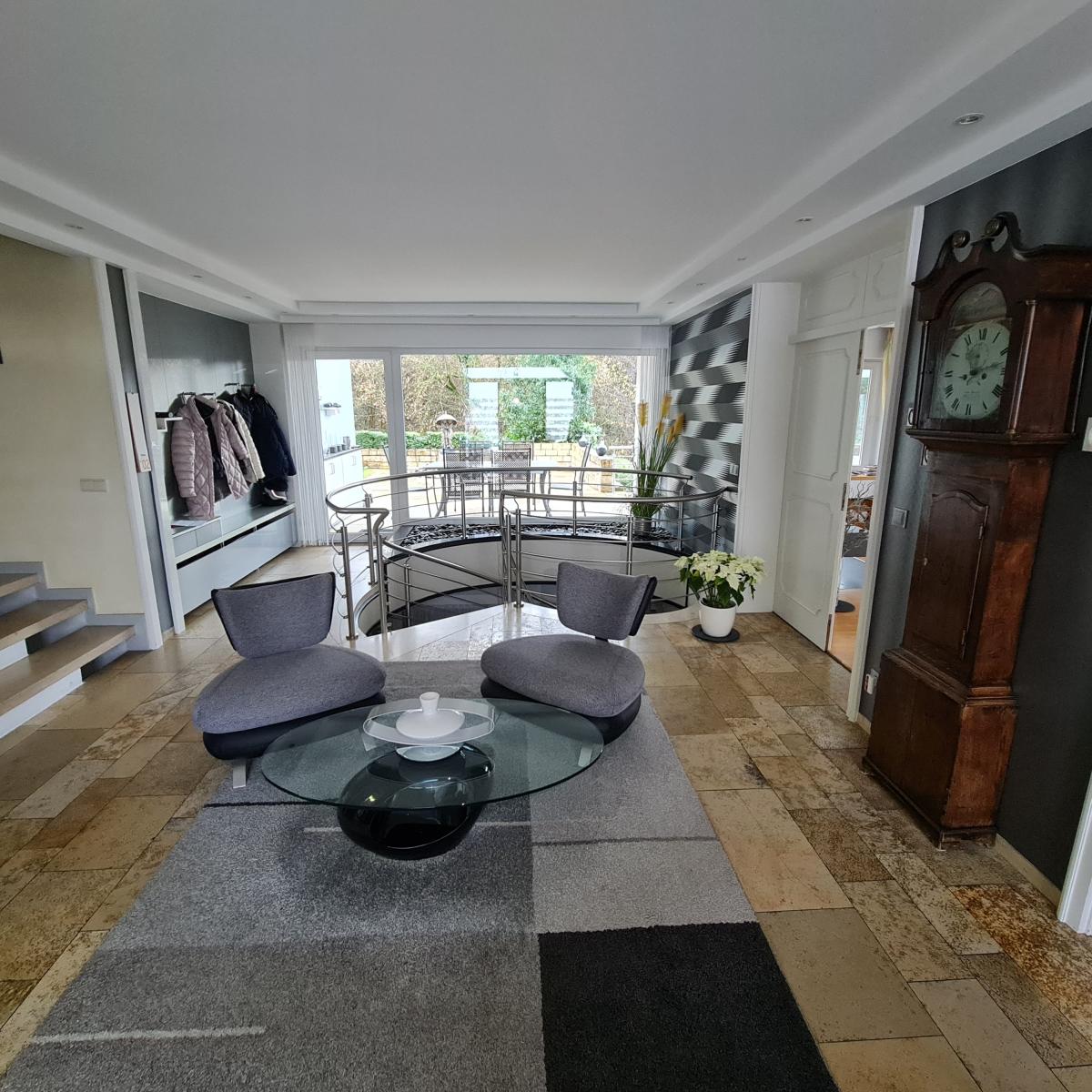 Der einladende Wohn- und Essbereich mit gemütlichem Kamin bildet das Herzstück des Hauses - ideal für gesellige Abende und entspannte Stunden. Von hier aus gelangen Sie in den sonnendurchfluteten Wintergarten sowie auf die weitläufigen Terrassen, die zu gemütlichen Grillabenden oder zum Sonnen einladen.