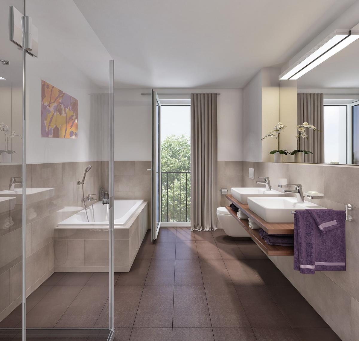 Die Wohneinheiten öffnen sich über helle, lichte Loggien und Terrassen nach Süden und Westen. Bodentiefe Fenster ermöglichen die gewünschte Verschmelzung von Innen- und Außenraum. Offene Wohn-Essbereiche und natürlich belichtete Bäder erzeugen einen hochwertigen Wohnstandard.