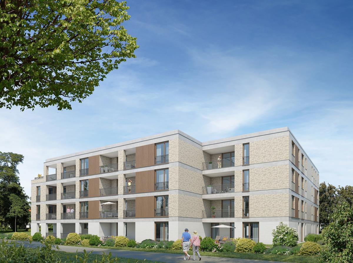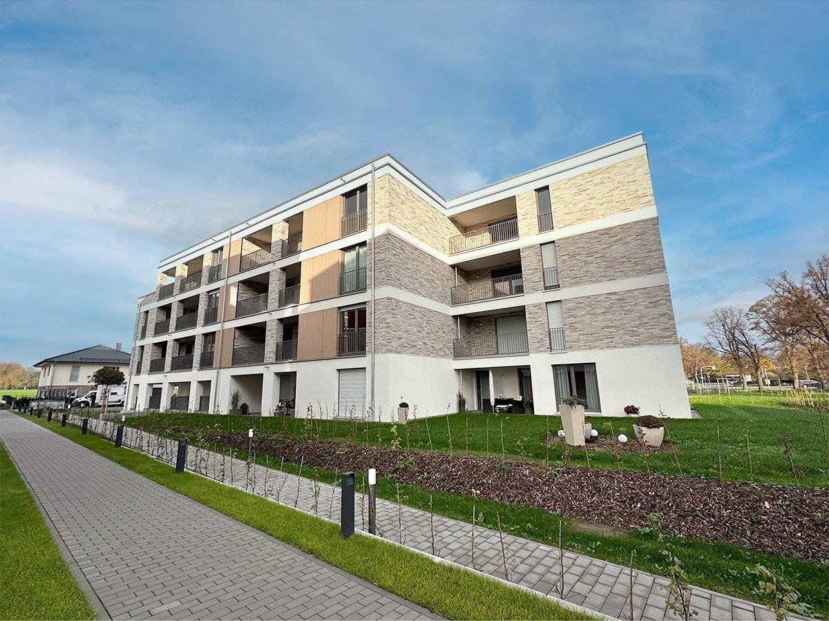 Auf großzügigen 2.973 m² Grundstücksfläche ist ein Mehrfamilienhaus mit hochwertiger Klinkerfassade entstanden. Eingebettet in schöne Grünanlagen gruppieren sich drei Gebäudeteile mit je sechs bzw. acht Wohnungen um einen Zugangshof. Drei-, Vier- und Fünf-Zimmer-Wohnungen bieten Wohnflächen von ca. 85 bis 132 m². In der Fassade kontrastieren sandfarbene Ziegelflächen in horizontaler Abfolge und helle Geschossbänder mit raumhohen Fensterelementen in einem Bronzeton und vertikalen Loggia-Auskleidungen.
