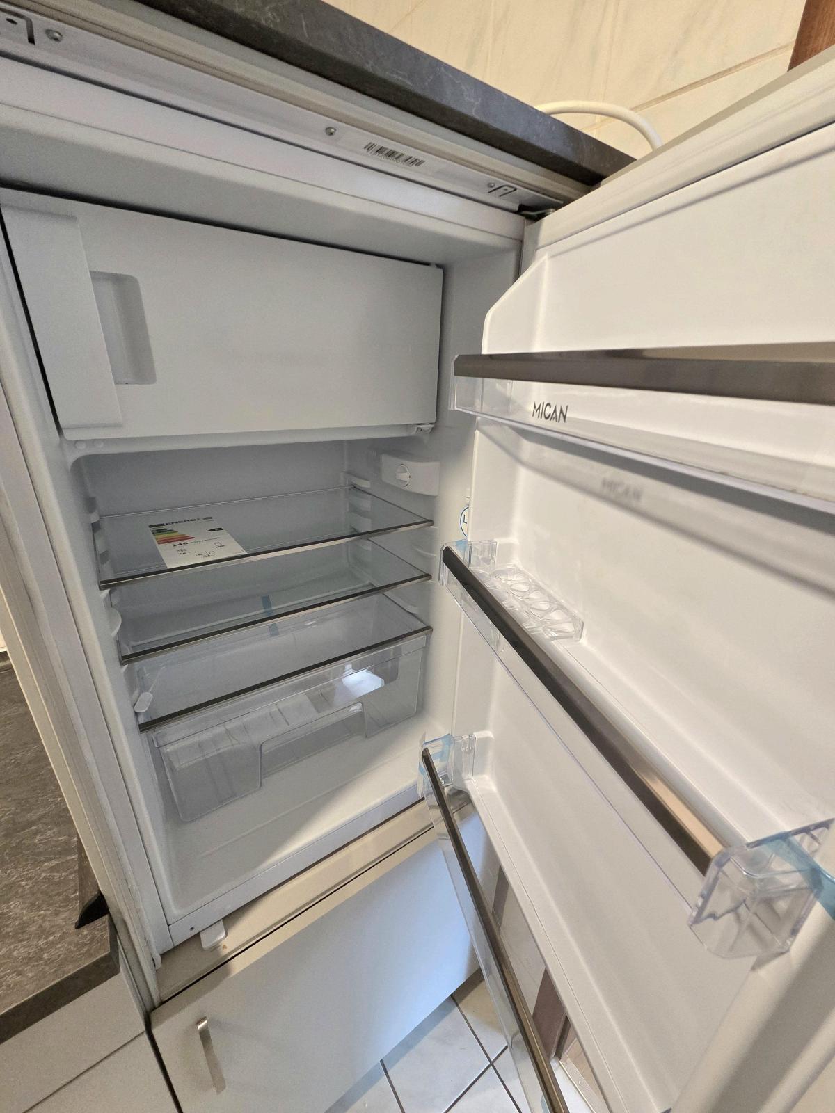 Die moderne Einbauküche verfügt über ein Cerankochfeld, einen Backofen sowie einen Kühlschrank mit Gefrierfach und bietet ausreichend Stauraum für alltägliche Küchenutensilien.