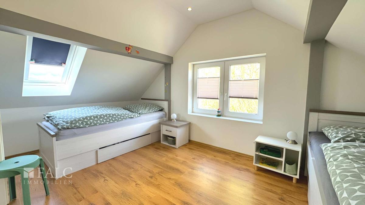 Im Obergeschoss stehen zwei Schlafzimmer zur Verfügung, die individuell genutzt werden können. Eines der Zimmer verfügt über einen direkten Zugang zu einem kleinen Balkon mit schönem Blick ins Grüne.