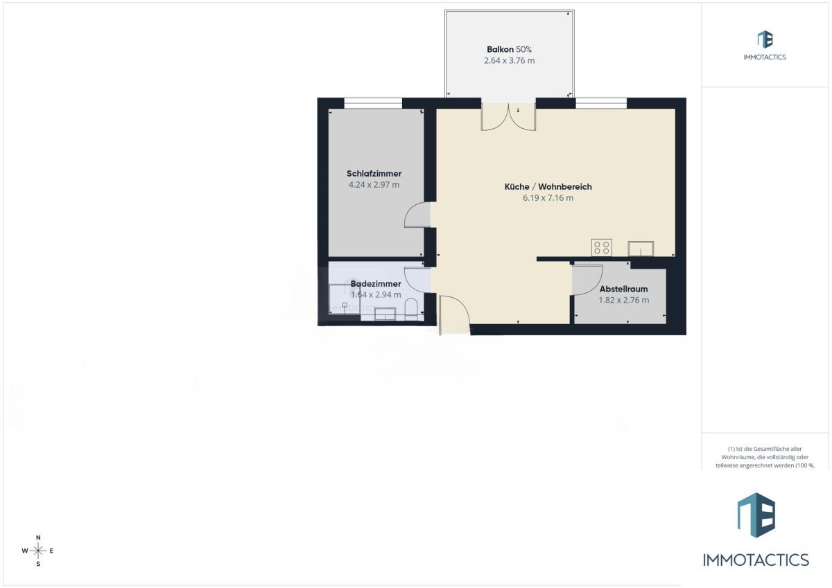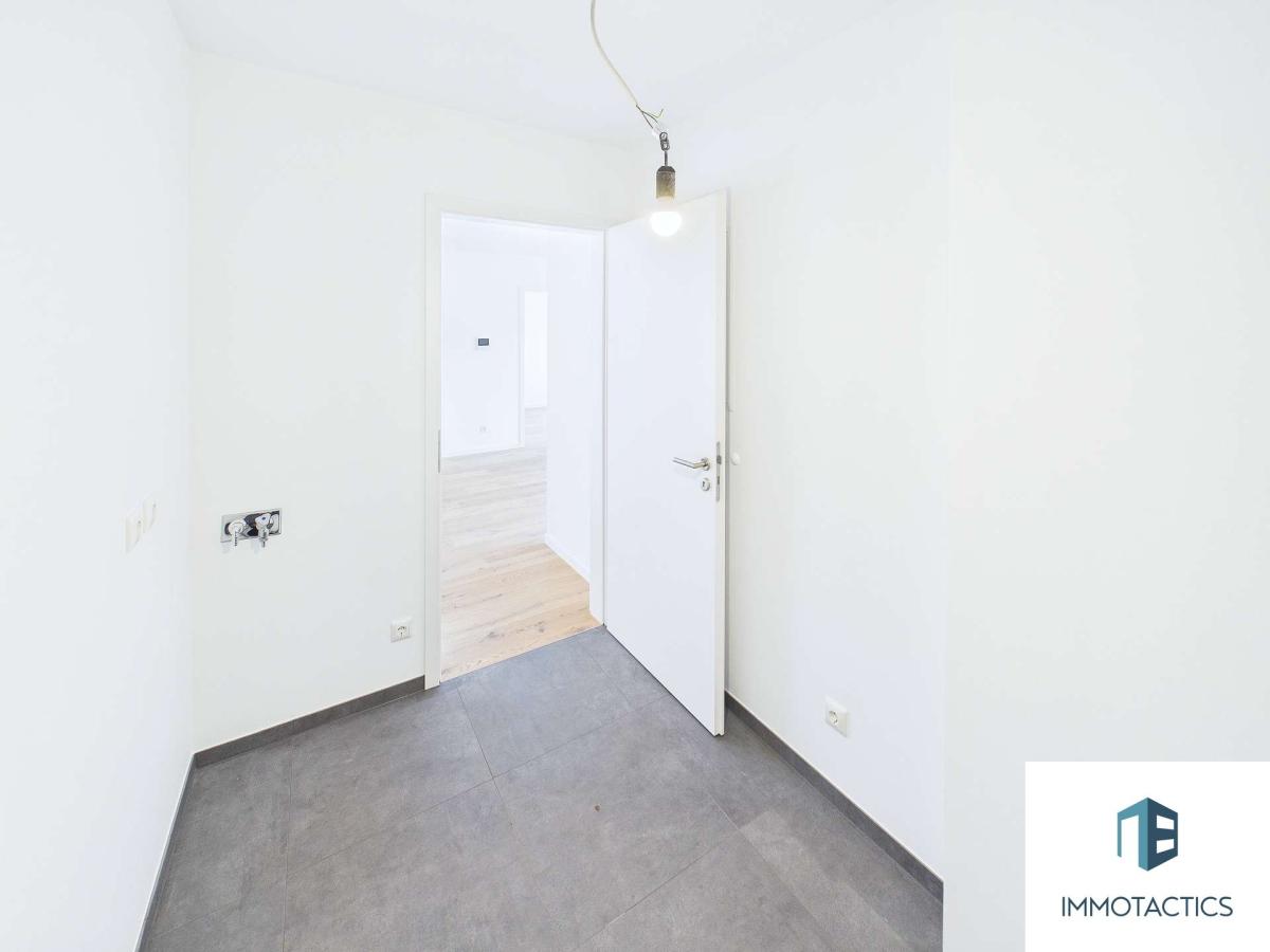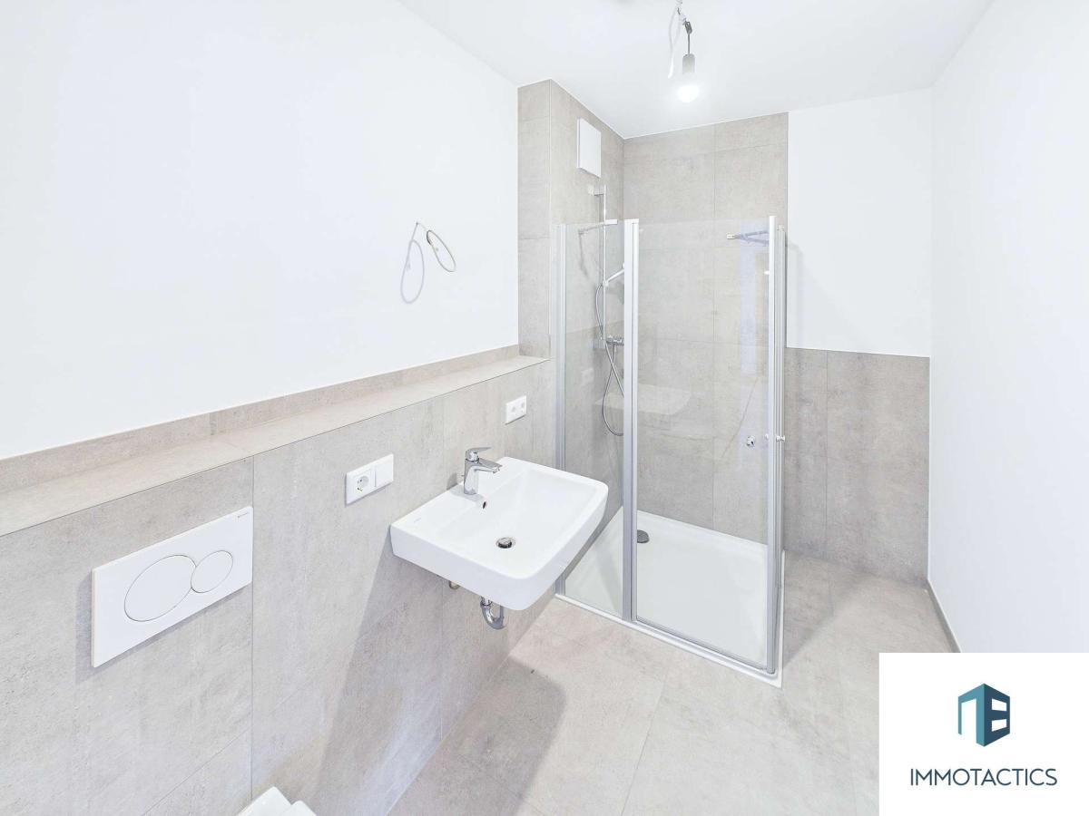 Das modern ausgeführte Badezimmer ist mit einer begehbaren Dusche ausgestattet. Ergänzt wird die Wohnung durch eine separate Abstellkammer mit Waschmaschinenanschluss – eine praktische Lösung, die den Wohnbereich entlastet.