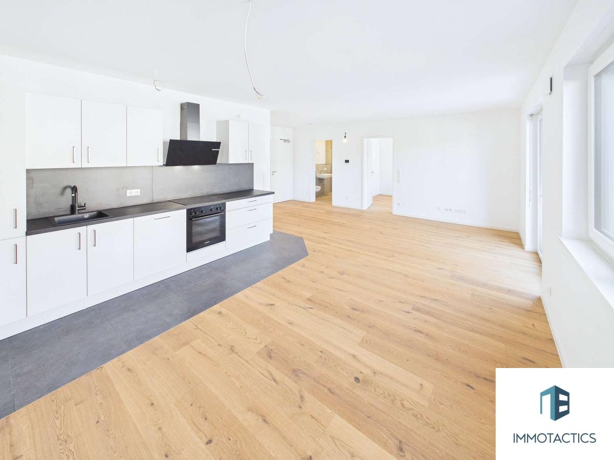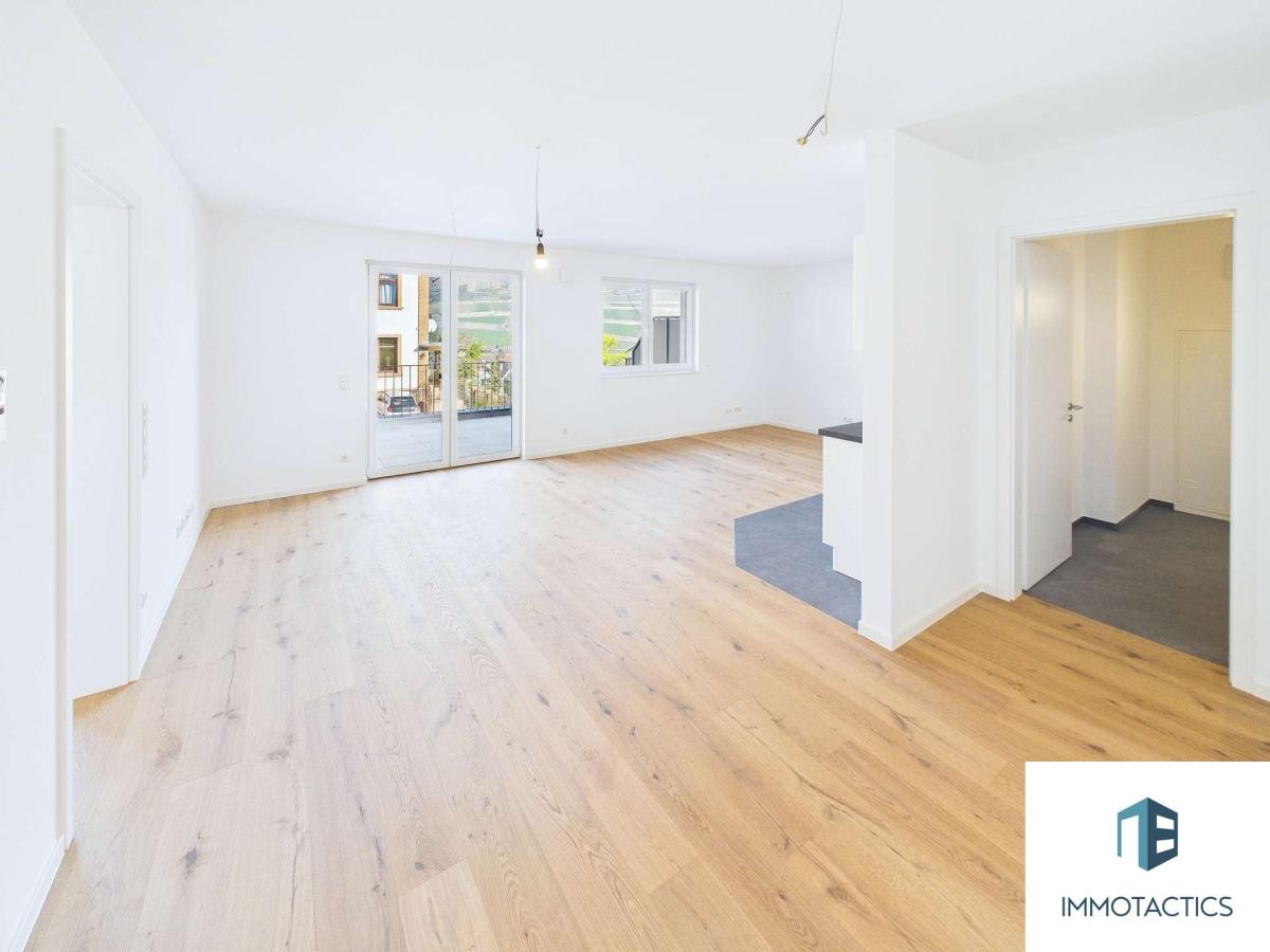 Der Wohn- und Essbereich ist offen gestaltet und führt direkt auf die knapp 9 m² große überdachte Terrasse mit Blick auf den Rhein – ein Standortvorteil, der die Wohnung spürbar aufwertet. Große, dreifach verglaste Fenster sorgen für eine gute Belichtung, während Rollläden zusätzlichen Komfort und Sichtschutz bieten.Im Innenraum wurde auf langlebige Materialien gesetzt: Echtholzparkett in Eiche im Wohnbereich, ergänzt durch Fliesen in Bad und Küchenbereich. Die Einbauküche ist bereits integriert und sofort nutzbar. Das Schlafzimmer ist gut geschnitten und bietet ausreichend Platz.