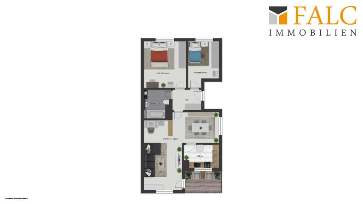 Die Wohnung überzeugt durch eine durchdachte Raumaufteilung mit drei gut geschnittenen Zimmern, die flexibel als Wohn-, Schlaf-, Kinder- oder Arbeitszimmer genutzt werden können. Der offen gestaltete Wohn- und Essbereich bildet das Herzstück der Wohnung und bietet direkten Zugang zum Balkon, der zusätzlichen Raum zur Erholung im Freien schafft. Eine separate Küche sowie ein funktional ausgestattetes Badezimmer ergänzen das Raumangebot.