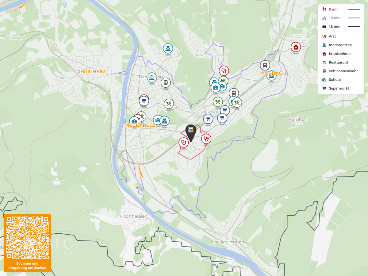 Die Mosbacher Innenstadt mit ihrer historischen Altstadt, vielfältigen Einkaufsmöglichkeiten sowie gastronomischen Angeboten ist nur wenige Kilometer entfernt und bequem erreichbar. Insgesamt bietet die Lage eine ideale Kombination aus ruhigem Wohnen und guter Anbindung an alle wichtigen Einrichtungen des täglichen Lebens.
