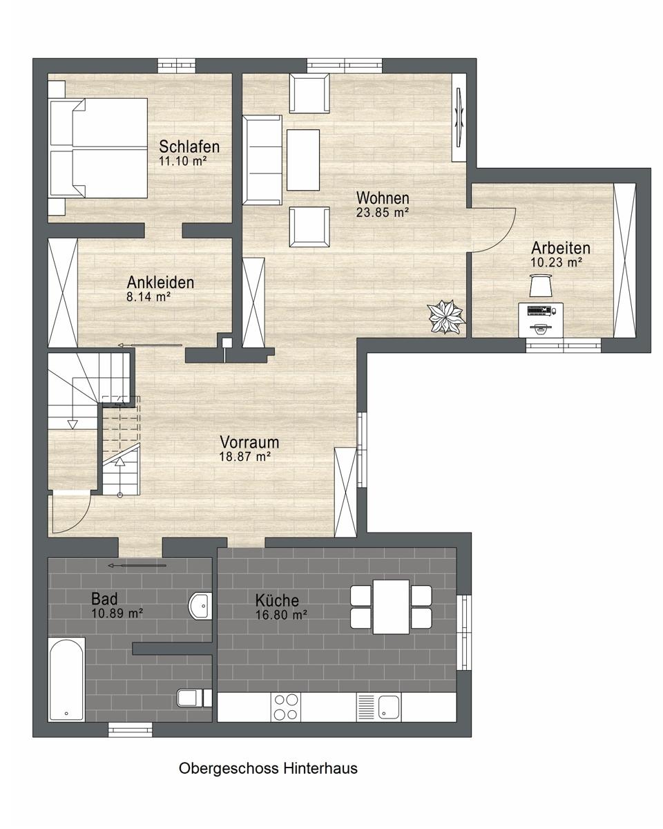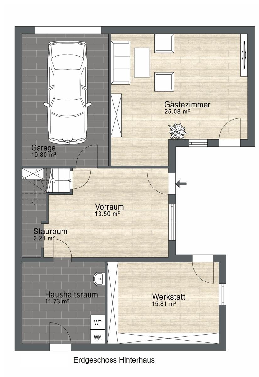 Das massiv erbaute Hinterhaus überzeugt mit viel Platz, Struktur und vielseitigen Nutzungsmöglichkeiten.