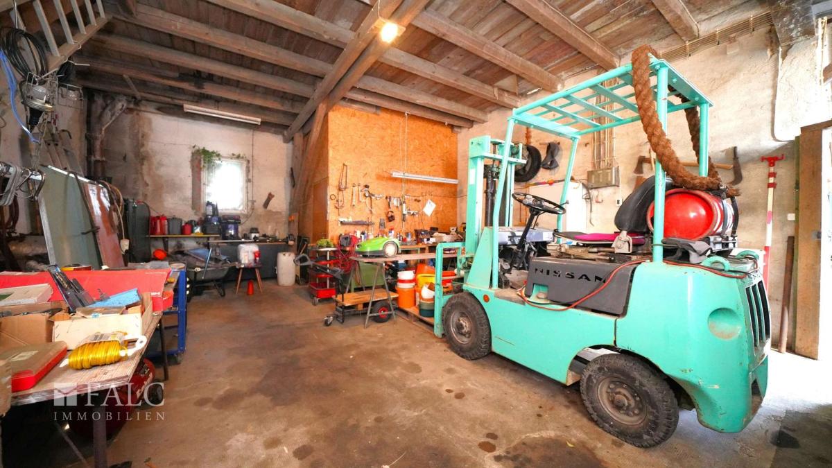 Zu diesem Anwesen gehört eine mehrstöckige Scheune mit zwei Garagen, eine Maschinenhalle, ein Schuppen, der als Gartenhäuschen mit Garagenanbau fungiert und eine ehemalige Brennerei mit Schlachthaus, in deren Räumlichkeiten eine Werkstatt mit Grube und Lagerflächen gebaut wurde.