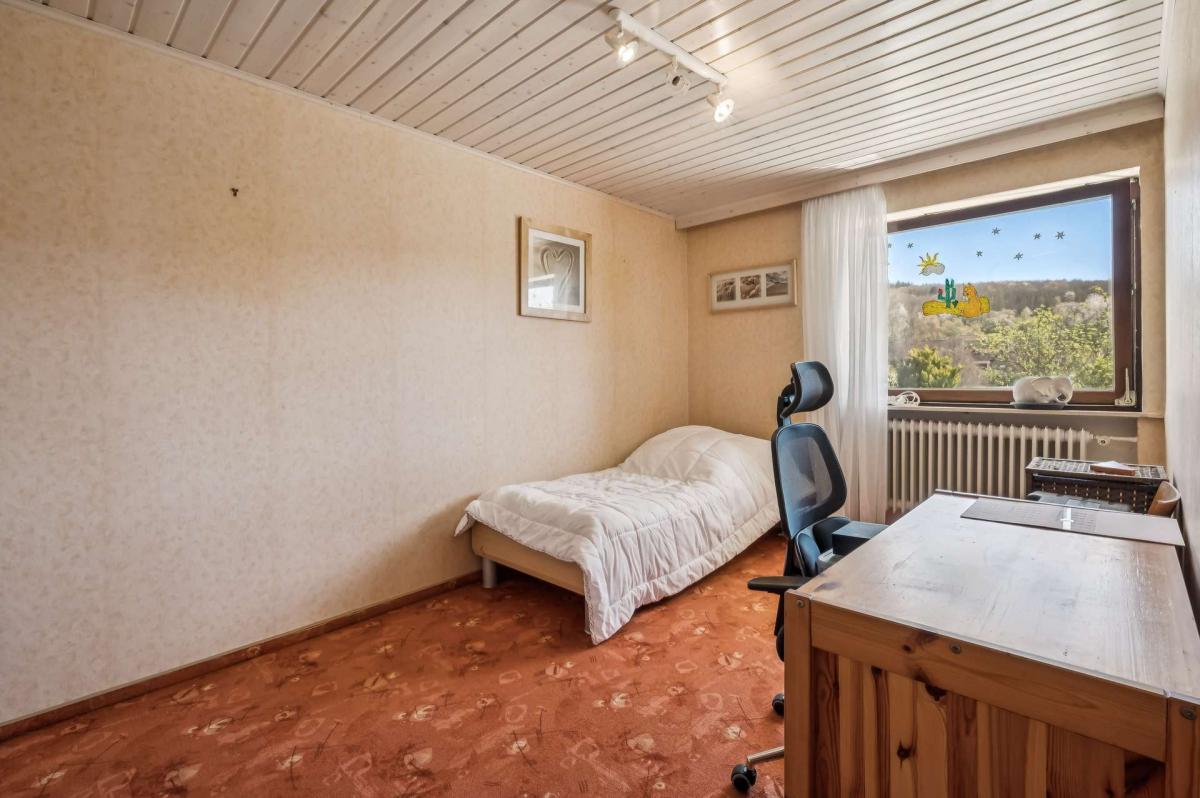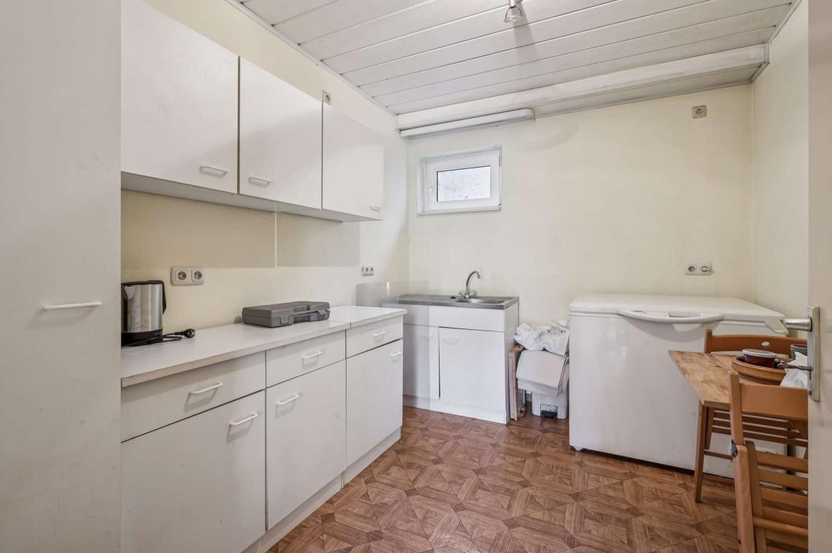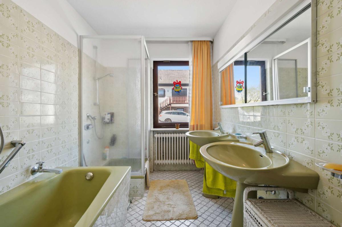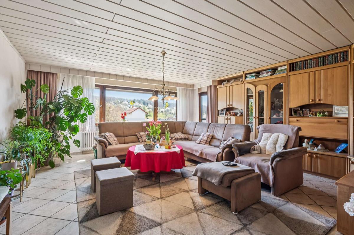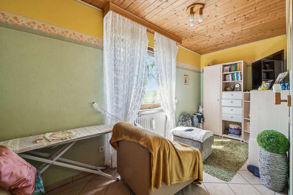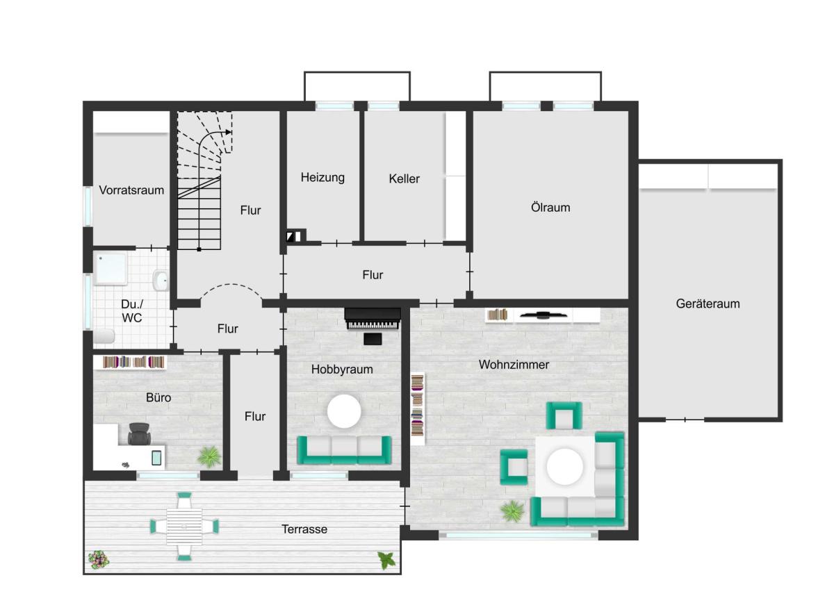 Über eine Treppe erreichen Sie das Untergeschoss, das ebenfalls vielfältige Nutzungsmöglichkeiten bietet. Hier befindet sich ein weiteres Wohnzimmer mit direktem Zugang zur südwestlich ausgerichteten, teilweise überdachten Terrasse sowie zum großzügigen Garten. Darüber hinaus stehen ein Büro, ein wohnlich ausgebauter Hobbyraum, ein Tageslicht-Duschbad mit WC, ein Vorratsraum sowie ein Kellerraum zur Verfügung. Ergänzt wird diese Ebene durch den Heizungs- und Ölraum.