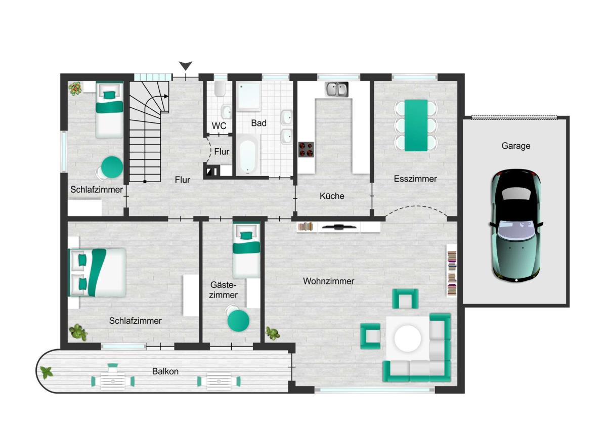Im Erdgeschoss gelangen Sie durch die Haustür in einen einladenden Eingangsflur, von dem aus alle Räume bequem erreichbar sind. Hier befinden sich ein geräumiges Wohnzimmer mit angrenzendem Esszimmer, welches ein angenehmes Wohnambiente schafft. Vom Wohnzimmer aus haben Sie direkten Zugang zu dem südwestlich ausgerichteten Balkon, der zu entspannten Stunden im Freien einlädt. Des Weiteren stehen Ihnen eine separat gelegene Küche, ein Tageslichtbadezimmer ausgestattet mit Badewanne und Dusche, ein separates WC, zwei Schlafzimmer sowie ein Gästezimmer zur Verfügung.