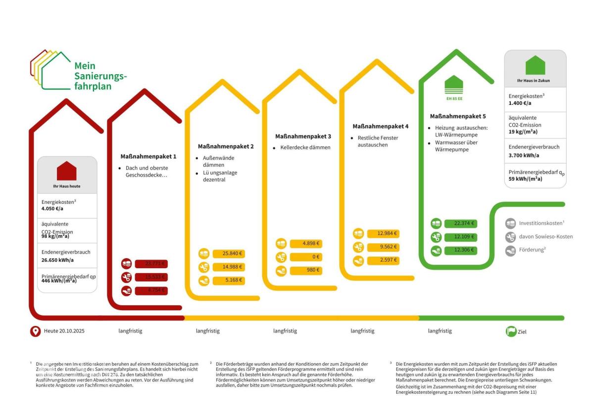 Um das Objekt energetisch auf den neuesten Stand zu bringen haben wir für Sie einen Überblick über die dabei entstehenden geschätzten Kosten (ca. 89.867 € ohne Berücksichtigung von Fördermitteln) von einem Energieeffizienzexperten erstellen lassen. Es bietet eine strukturierte Übersicht über die geplanten Modernisierungsmaßnahmen. Dies ermöglicht eine transparente, planbare und wirtschaftlich attraktive Umsetzung der Sanierung. Ein Schaubild dazu finden Sie in den Bilddateien. Gerne stellen wir Ihnen den individuellen Sanierungsfahrplan und die empfohlenen Maßnahmen bei einem persönlichen Besichtigungstermin vor.