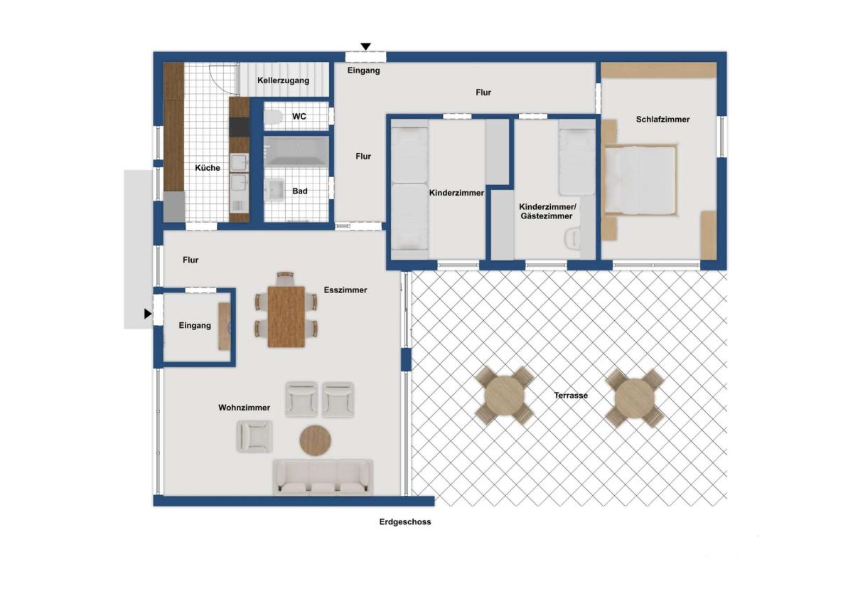 Im weiteren Verlauf des Flurs gelangen Sie in die Schlafräume der Immobilie. Zwei gut geschnittene Kinderzimmer bieten ausreichend Platz für individuelle Gestaltungsmöglichkeiten und können je nach Bedarf auch als Gästezimmer, Büro oder Hobbyraum genutzt werden. Das großzügige Hauptschlafzimmer überzeugt nicht nur durch seine angenehme Größe, sondern auch durch den direkten Zugang in den Garten. Diese Verbindung zwischen Innen- und Außenbereich sorgt für ein besonders hohes Maß an Wohnqualität und ermöglicht einen entspannten Start in den Tag.