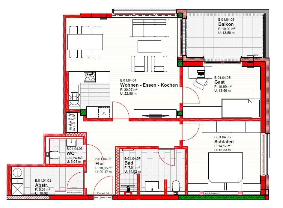 Ihr neues Zuhause befindet sich im I. Obergeschoss eines Wohn- und Geschäftshauses und verfügt über ca. 85,46 qm Wohnfläche. Sie erreichen Ihre Wohnung bequem mit dem Fahrstuhl oder über das großzügige Treppenhaus. Der Wohn-, Ess- und Kochbereich ist offen gestaltet. Vom Wohnbereich und vom Gäste-/Kinderzimmer bzw. Büro haben Sie Zugang auf Ihren Balkon. Ihr Bad ist mit einer ebenerdigen Dusche und einem Handtuchwärmekörper ausgestattet. Der Eingangsbereich mit Gäste-WC bietet Platz für eine Garderobe. Waschmaschine und Trockner finden im Hauswirtschaftsraum Platz. Im Keller befindet sich ein zusätzlicher, abschließbarer Abstellraum. Zu Ihrer Wohnung gehört ein PKW-Stellplatz und eine Fahrradgarage.