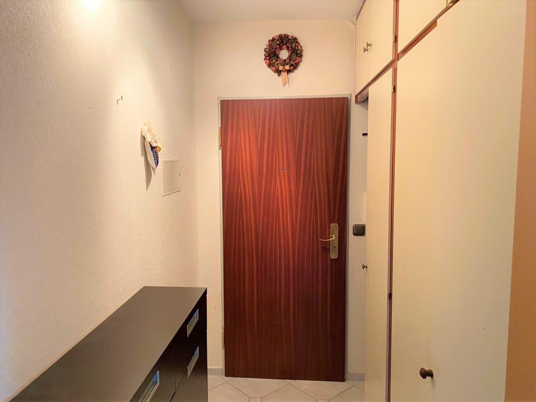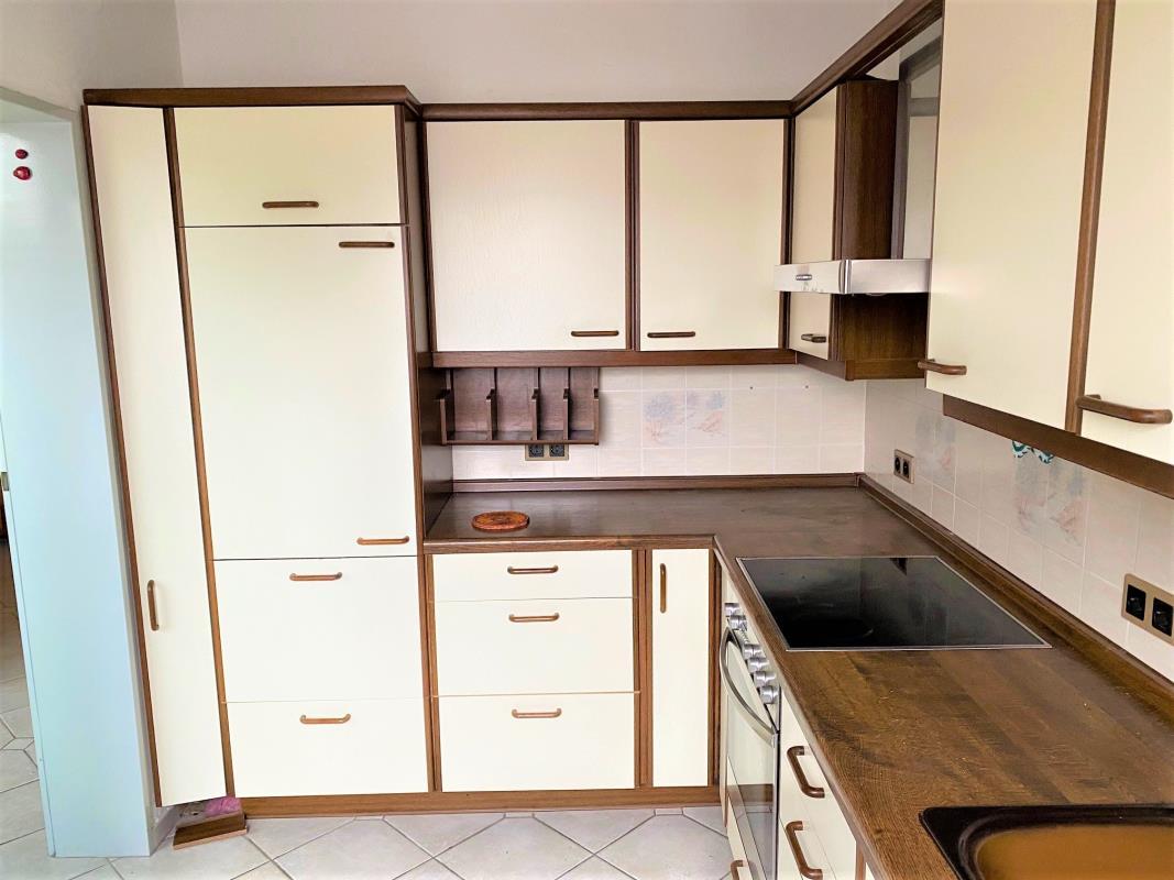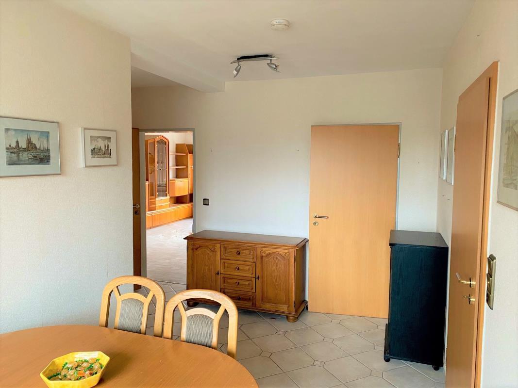Das geräumige und helle Wohnzimmer hat als Bodenbelag helles Laminat erhalten, welches aber einige Schäden aufweist und ausgetauscht werden müsste. Der Eingangsbereich und die Diele mit der zur nördliche Loggia ausgerichteten Essecke, sowie die angrenzende Küche sind mit hellgrauen Bodenfliesen ausgestattet. Das Arbeitszimmer und das Schlafzimmer Teppich-Auslegware erhalten. Das Badezimmer ist hellbeige türhoch gefliest.