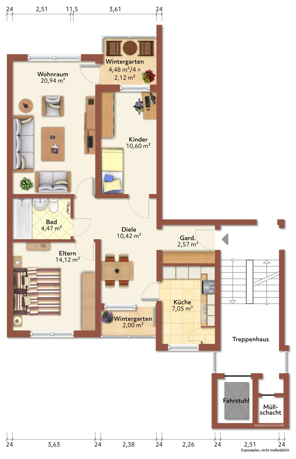 Insgesamt stehen bei der angebotenen Wohnung 3 Wohn- Schlafräume, eine Küche, ein Badezimmer, zwei als kleine Wintergärten ausgebaute Loggien, ein Kellerraum und ein Tiefgaragenstellplatz zur Verfügung. Ein Personenaufzug ist vorhanden.