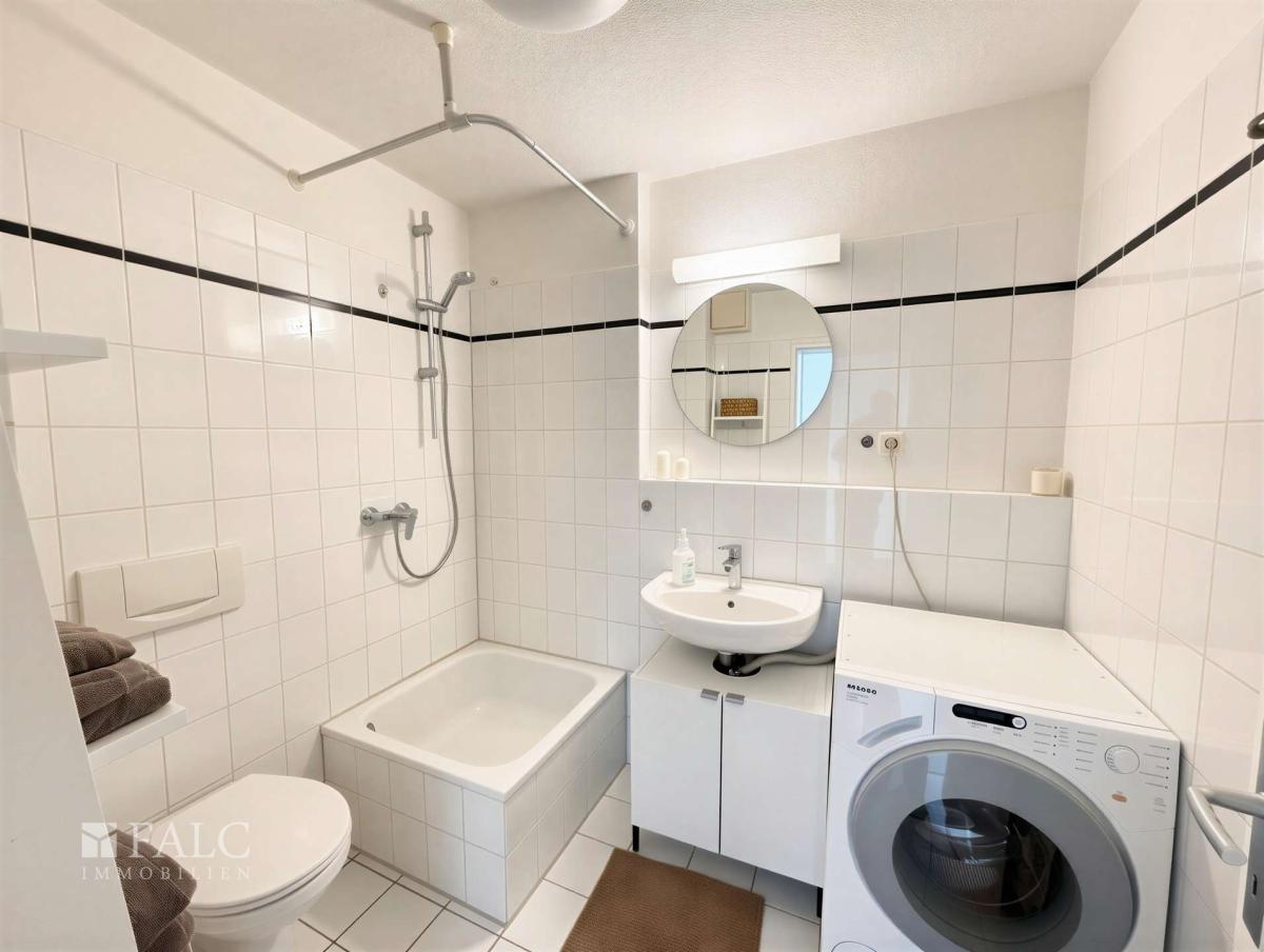 Das separate Schlafzimmer bietet ausreichend Platz und Rückzugsmöglichkeiten. Das Badezimmer ist modern ausgestattet und verfügt über eine Dusche sowie einen praktischen Waschmaschinenanschluss innerhalb der Wohnung.