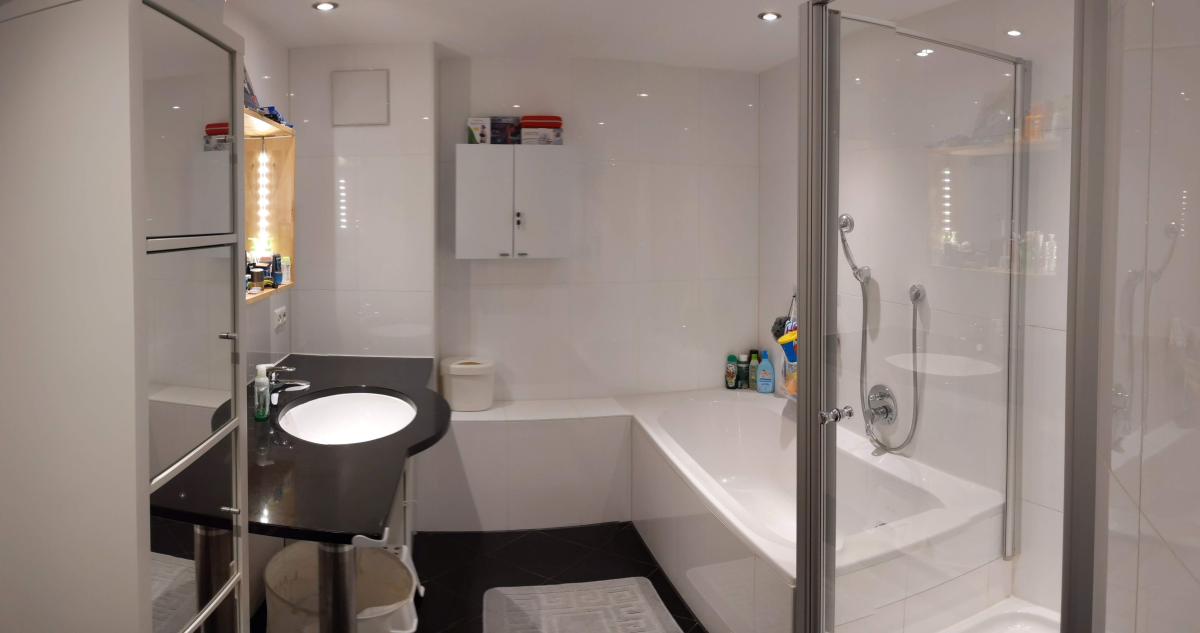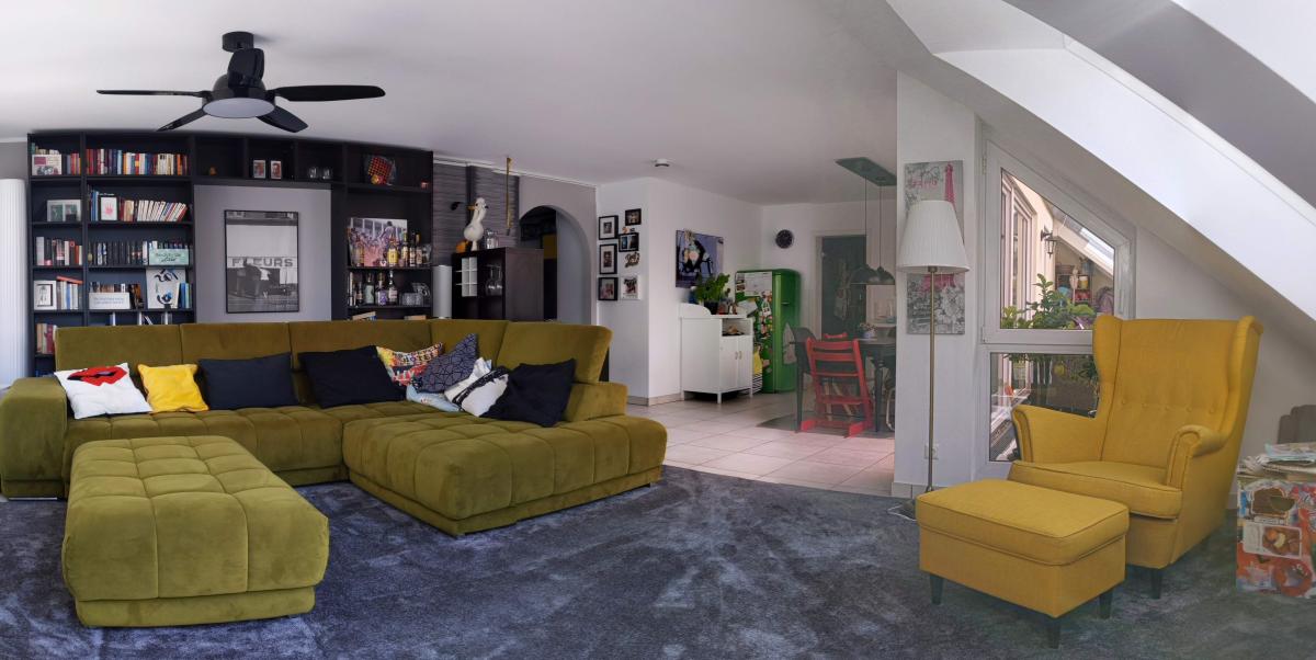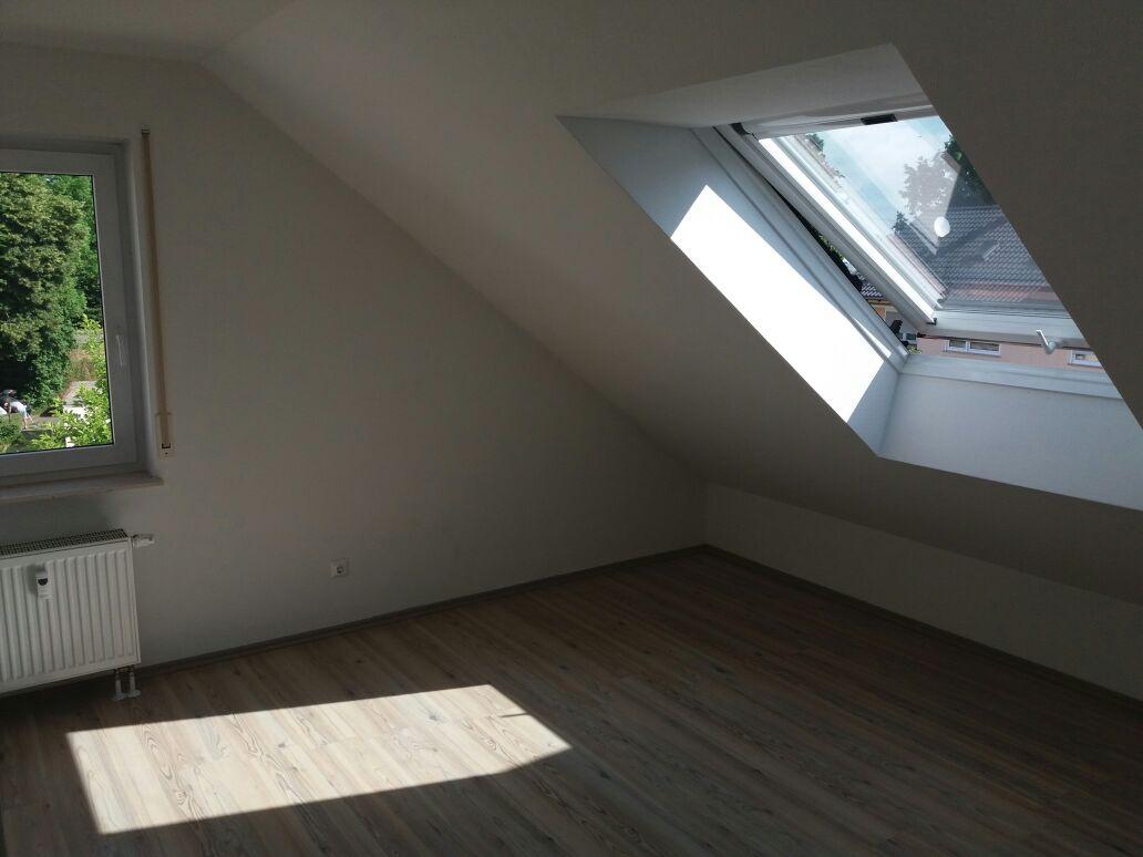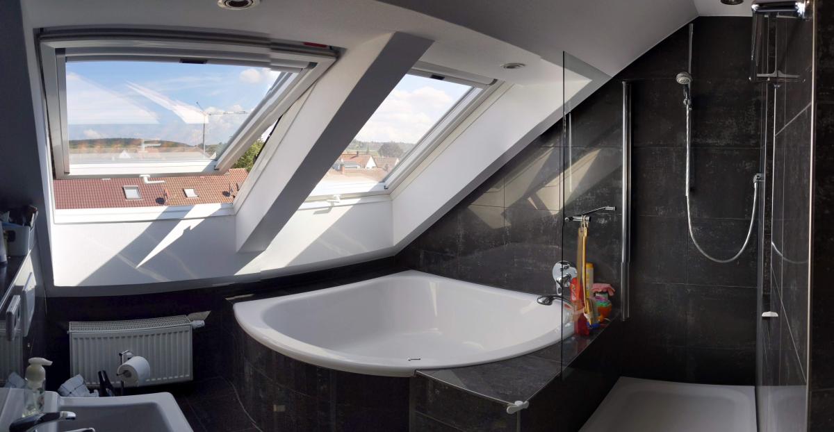 Eine helle Treppe führt Sie in die obere Etage der Wohnung. Diese bietet zwei weitere Zimmer, die beispielsweise als großes Schlafzimmer und Ankleide/ Wäschezimmer (Wasseranschluss vorhanden) nutzbar sind. Alternativ freuen sich hier die Kinder über einen eigenen Bereich. Zusätzlich befindet sich auf dieser Etage das große Masterbad mit Eckbadewanne, Dusche sowie WC. In der Badewanne liegen und den Sternenhimmel anschauen? Hier ist es möglich. Der Flur bietet weiterhin Platz für ein kleines, offenes Büro.