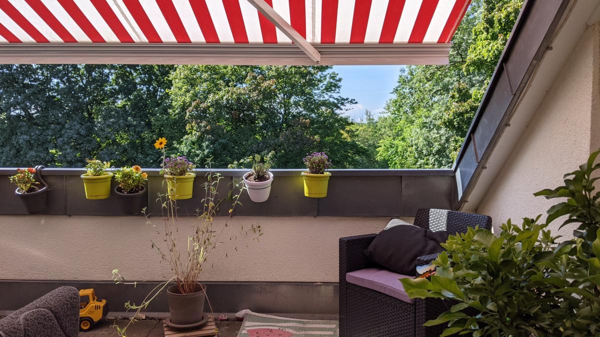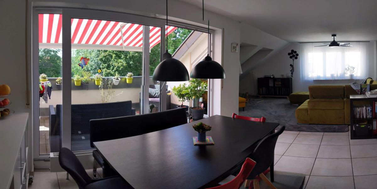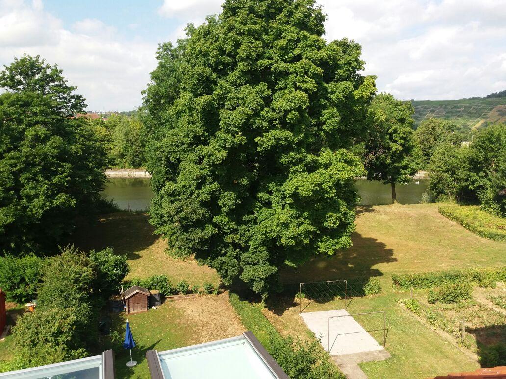 Auf der unteren der beiden Etagen befindet sich der große und lichtdurchflutete Wohn-/Essbereich mit Zugang zum Süd-Balkon. Von hier aus haben Sie einen wunderschönen Blick ins Grüne und auf den Neckar. Im Sommer bewahrt Sie die große, elektrisch steuerbare, Markise vor zu viel Sonne. An den Essbereich angrenzend befindet sich die hochwertige Küche mit Markengeräten. Im vorderen Bereich der Wohnung stehen Ihnen ein Badezimmer mit Dusche und Badewanne sowie separatem WC und drei weitere Zimmer, nutzbar beispielsweise als Arbeits-, Schlaf- oder Kinderzimmer, zur Verfügung.
