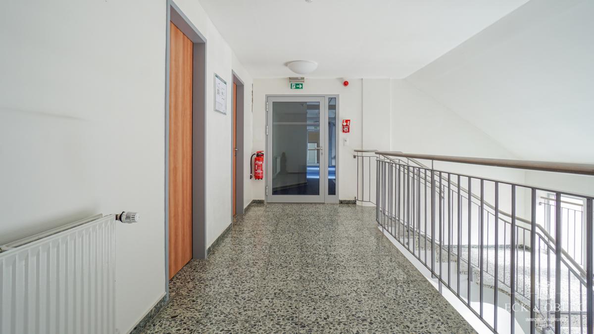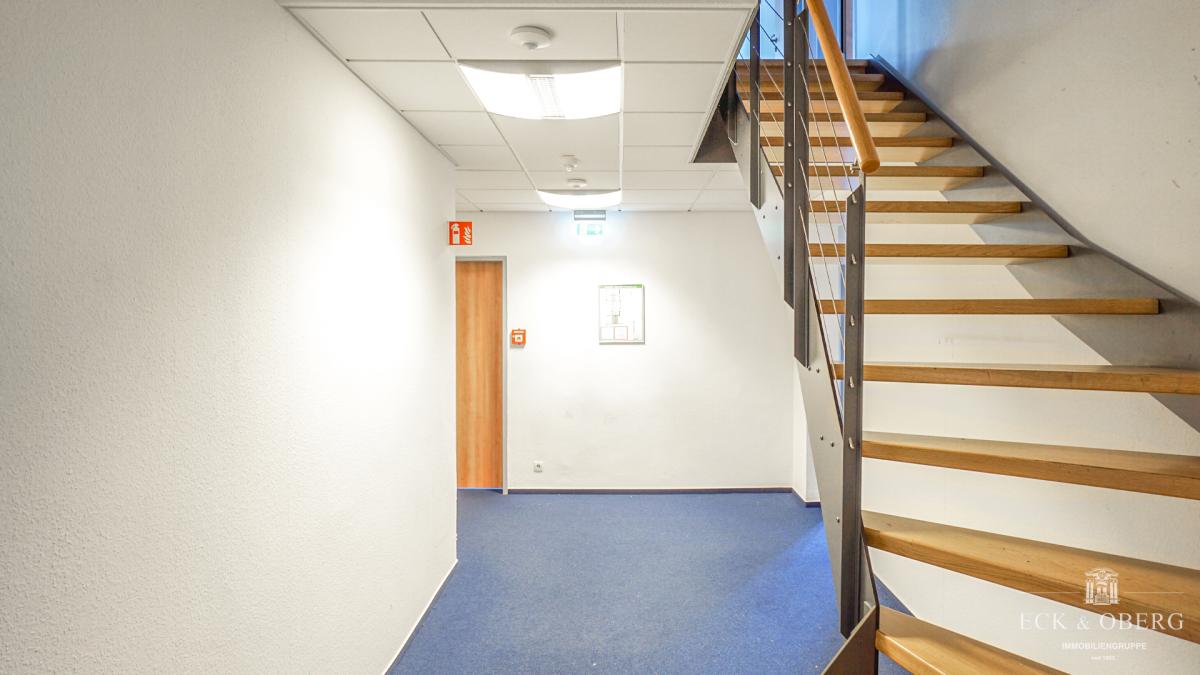 Über das zentrale Treppenhaus gelangen Sie ins erste Obergeschoss, wo ein heller, langgezogener Flur zu mehreren Büroräumen führt, alle mit Teppichboden ausgestattet. Am Ende des Flurs erwarten Sie weitere Arbeitsräume sowie eine Holztreppe, die ins Dachgeschoss führt. Auf halber Treppe eröffnet sich ein großzügiger Büroraum, ideal für Teams oder Besprechungen.