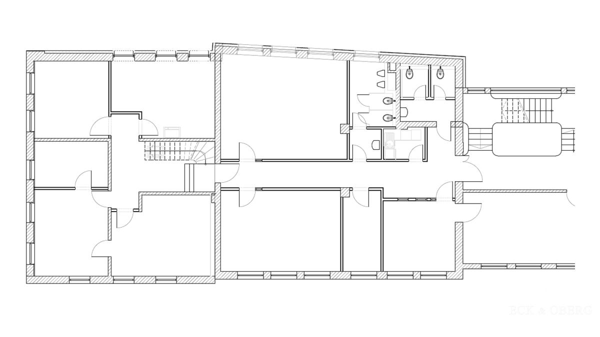 Die Ostfassade erhielt ein mineralisches Wärmedämmverbundsystem mit Putz, um den Wärmeschutz erheblich zu verbessern. An der Nordfassade wurde die Fassade neu verfugt und mit einer 50 mm starken Innendämmung ausgestattet, um das historische Erscheinungsbild zu bewahren. Beide Fassaden, Nord und Ost, wurden zudem mit neuen dreifach verglasten Fenstern ausgestattet, die sowohl den Wärmeschutz als auch den Schallschutz deutlich verbessern. Zur Erhöhung der Sicherheit wurde eine flächendeckende Brandmeldeanlage installiert, die als interne Brandfrühsterkennung dient. Im Erdgeschoss wurden die Sanitäranlagen vollständig erneuert, ebenso wurde eine neue Teeküche eingebaut, um die Aufenthaltsqualität und Funktionalität des Gebäudes weiter zu verbessern.