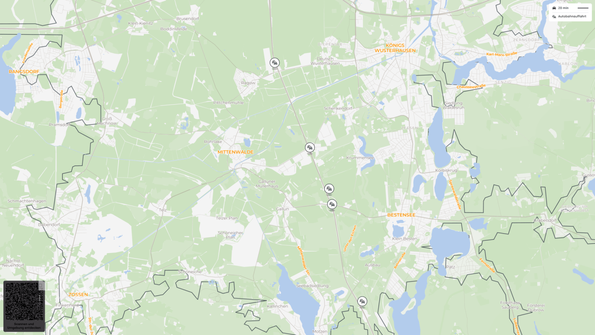 Auch der öffentliche Nahverkehr ist nutzbar, wenn auch eher ergänzend: Die Bahnhöfe Bestensee und Königs Wusterhausen liegen im weiteren Umfeld und sind mit dem Auto in kurzer Zeit erreichbar. Für überregionale Reisen und Geschäftstermine bietet der Flughafen Berlin Brandenburg eine praxistaugliche Option und ist je nach Verkehrslage in etwa 20 bis 30 Minuten erreichbar.