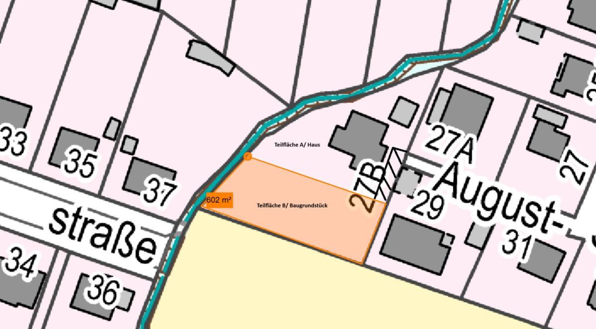 Aktuell handelt es sich noch um ein ca. 1.393 m² großes Grundstück, das in zwei eigenständige Grundstücke aufgeteilt wird (siehe Bild Grundstück Teilung). Die linke Grundstückshälfte (Teilfläche B) wird als Baugrundstück separat abverkauft. Natürlich ist auch ein Erwerb des gesamten Grundstücks möglich.