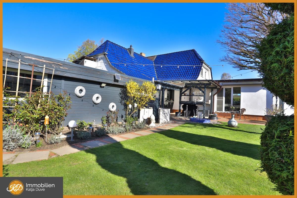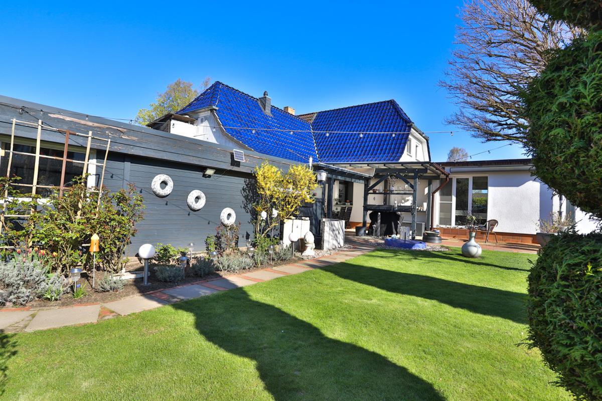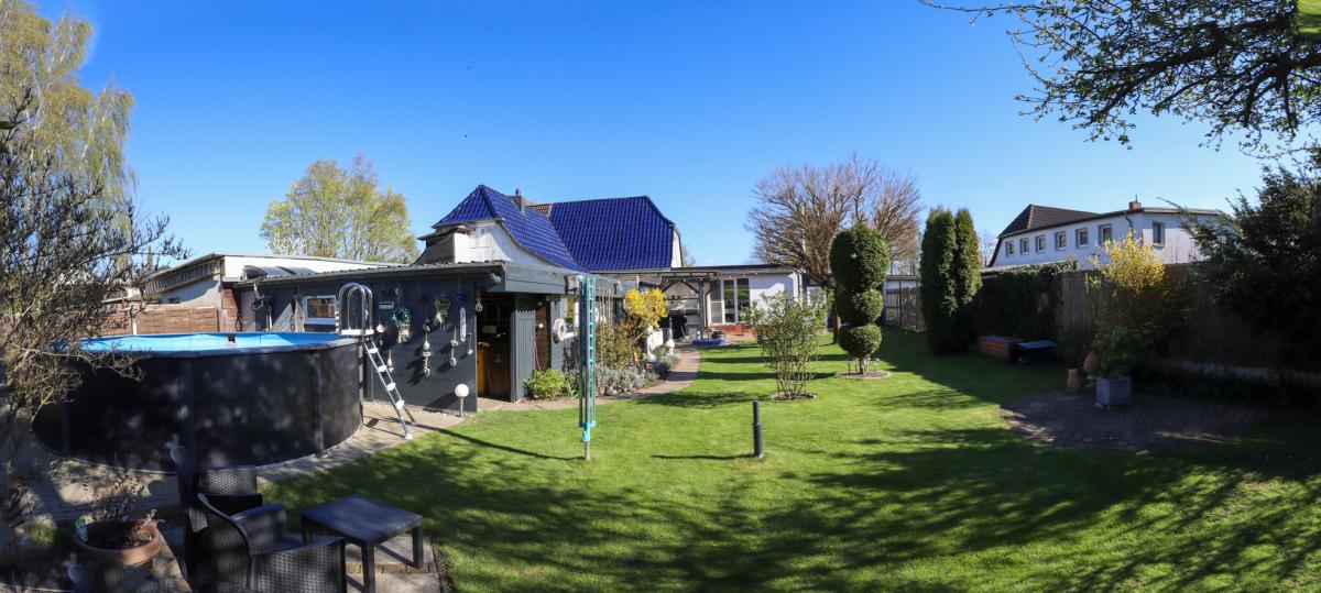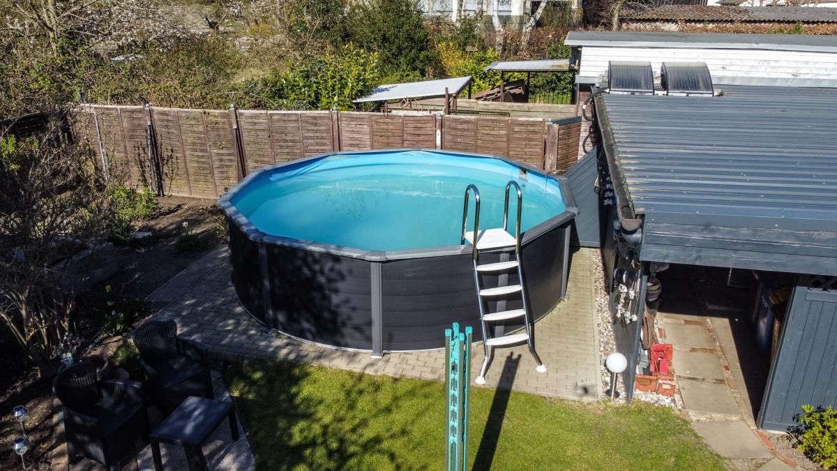 Im Garten ist es ruhig, die Vögel zwitschern und es erwartet uns ein himmelblauer, gepflegter Pool an dem sich in heißen Sommertagen erfrischt werden kann. An Unterstellmöglichkeiten wurde ausreichend gedacht. Ob nun Gartenhäuschen, Liegefläche, Rasen zum Spielen oder eine Außentoilette - an alles ist gedacht und lädt an schönen Tagen zum verweilen ein.