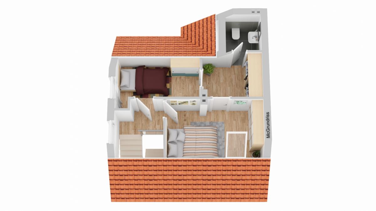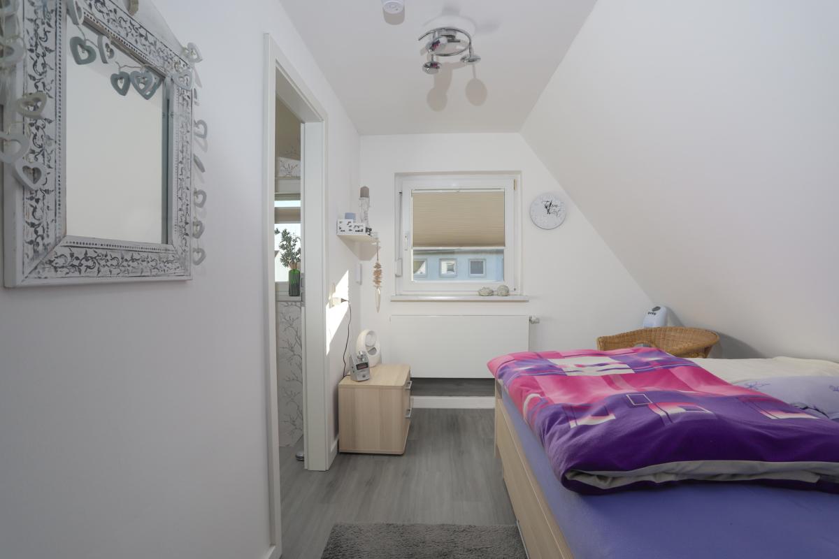 Über die Treppe im Flur gelangen wir in das Obergeschoss der Doppelhaushälfte, welche 1922 erbaut worden ist. Hier erwarten uns zwei freundliche Kinder- oder Schlafzimmer, ein geräumiges Ankleidezimmer und ein Bad mit WC und Waschbecken. Sollte der Platz nicht reichen, könnte man den restlichen Dachboden auch noch ausbauen. Da sind der Phantasie keine Grenzen gesetzt.