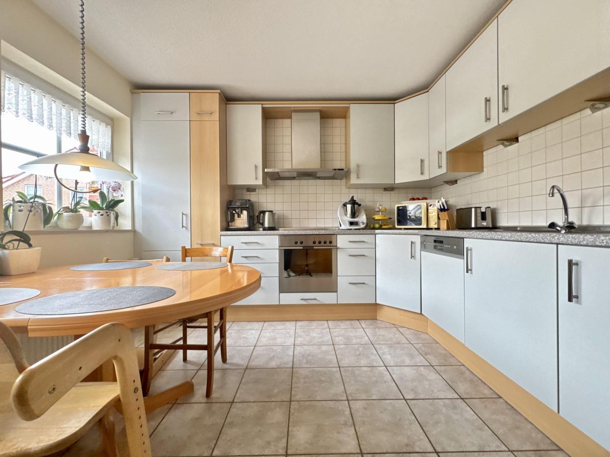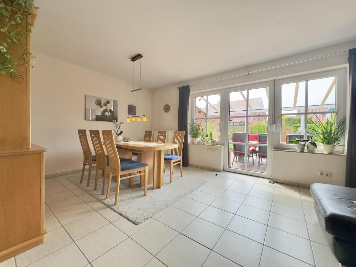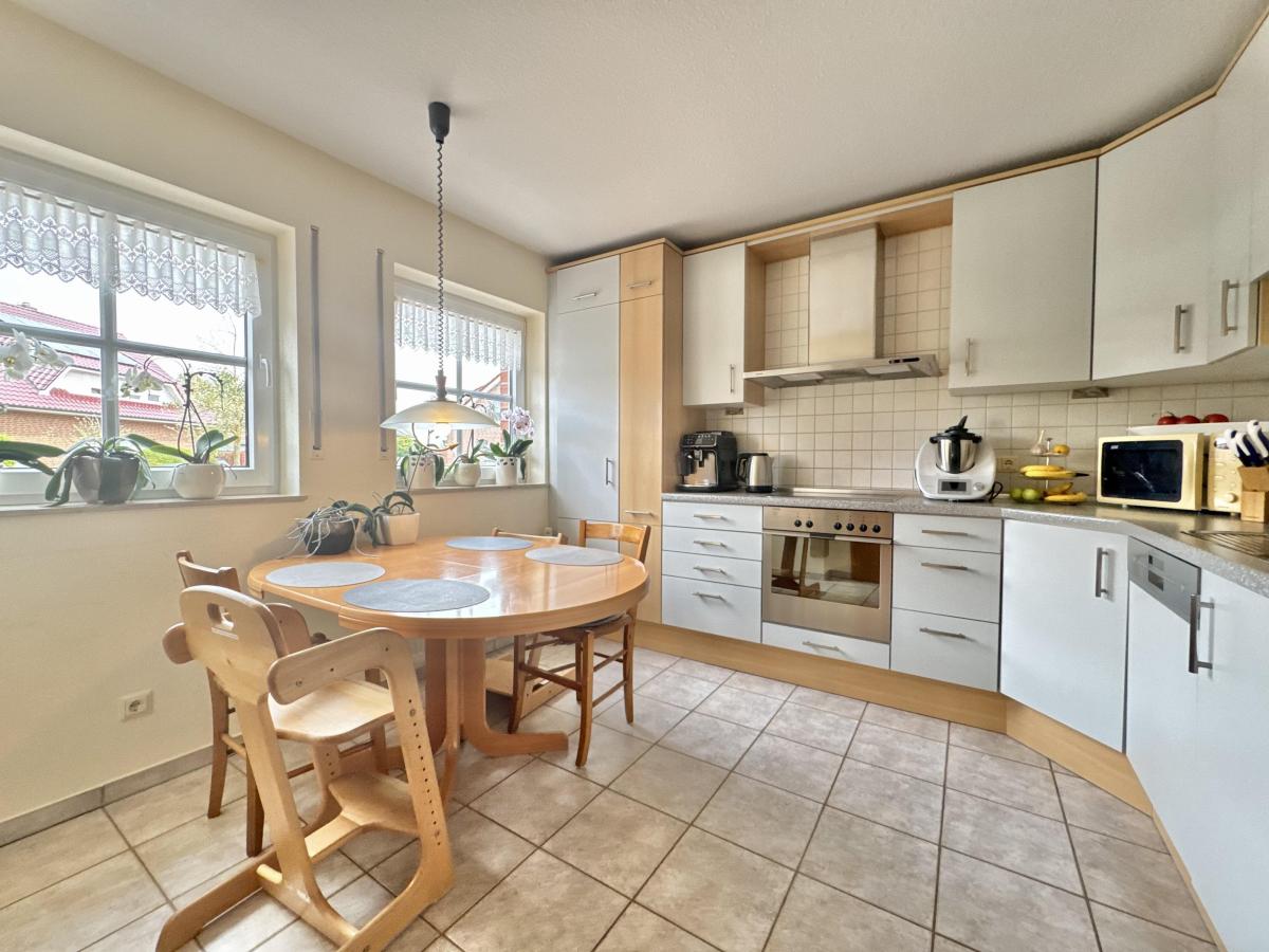 Herzstück des Hauses ist der helle Wohn- und Essbereich mit direktem Zugang in den Garten. Die vorhandene Einbauküche ist bereits im Kaufpreis enthalten.