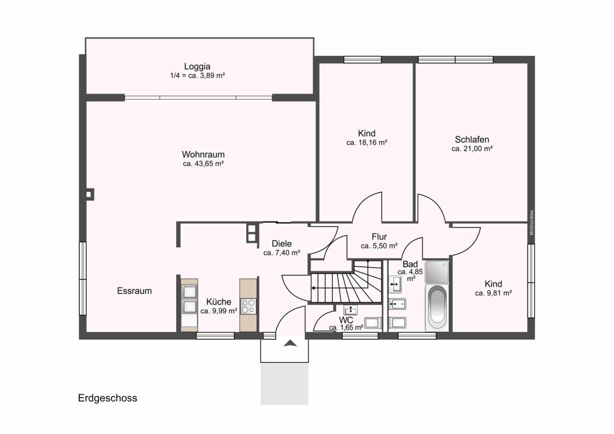 Die Erdgeschossetage verfügt neben einer Küche, einem Gäste-WC und einem großzügigen Badezimmer, über einen lichtdurchfluteten Wohn- und Essbereich, welcher direkten Zugang zur überdachten Loggia bietet. Ergänzt wird diese Etage durch drei weitere Zimmer, welche zum Schlafen oder als Büro genutzt werden können.