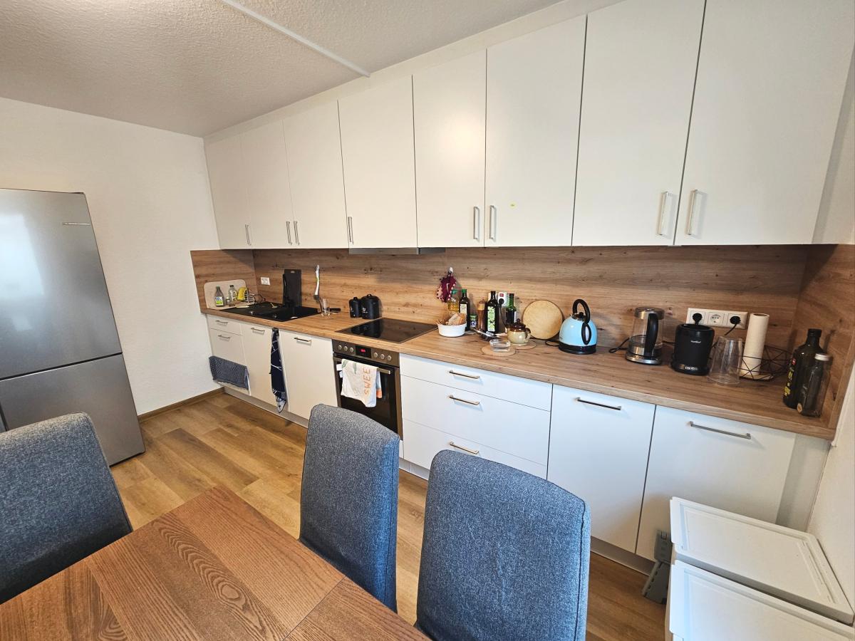 Es steht eine Küche mit Einbauküche und Inventar zur Verfügung sowie einem Esstisch und Bestuhlung.