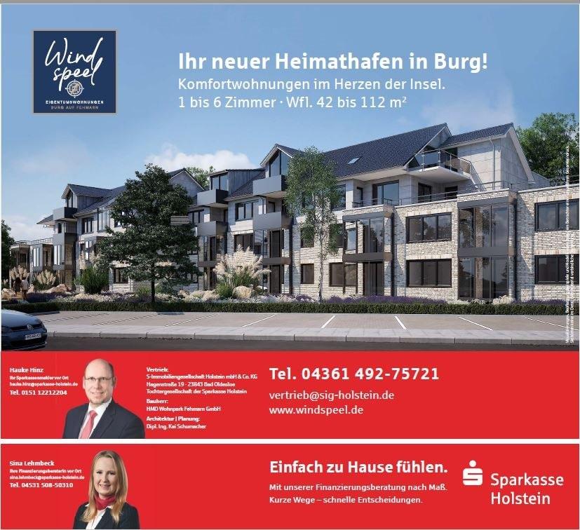 Nur drei Gehminuten entfernt bis zum historischen Marktplatz von Burg, dem Mittelpunkt der Insel, entsteht das Ensemble ”Windspeel” mit 25 Eigentumswohnungen. Das beschauliche Zentrum des kleinen Ortes ist bequem fußläufig erreichbar. Der attraktive Yachthafen sowie der bekannte Südstrand sind nur wenige Minuten mit dem Auto entfernt. Die Planung des Ensembles entstand unter anderem auch mit dem Ziel einer nachhaltigen Bauweise. Aus diesem Grund werden die Wohnungen im Erdgeschoss und in der ersten Etage im Bestand realisiert und ein Großteil der massiven bestehenden Gebäudesubstanz genutzt. Die Planung und Gestaltung aller Wohneinheiten entsteht unter Berücksichtigung von modernster Technik und einer hochwertigen Ausstattung mit namhaften Markenherstellern.
