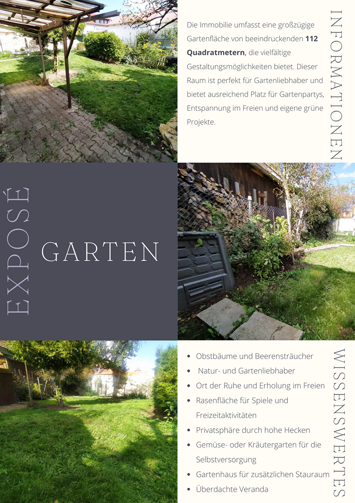 Garten mit Begrünung und Obstbaum: Entdecken Sie die Freuden des Outdoor-Lebens in Ihrem eigenen Garten. Der grüne Rasen und die gepflegten Pflanzen schaffen eine angenehme Atmosphäre. Ein Obstbaum versorgt Sie mit frischen Früchten direkt vor Ihrer Haustür.
