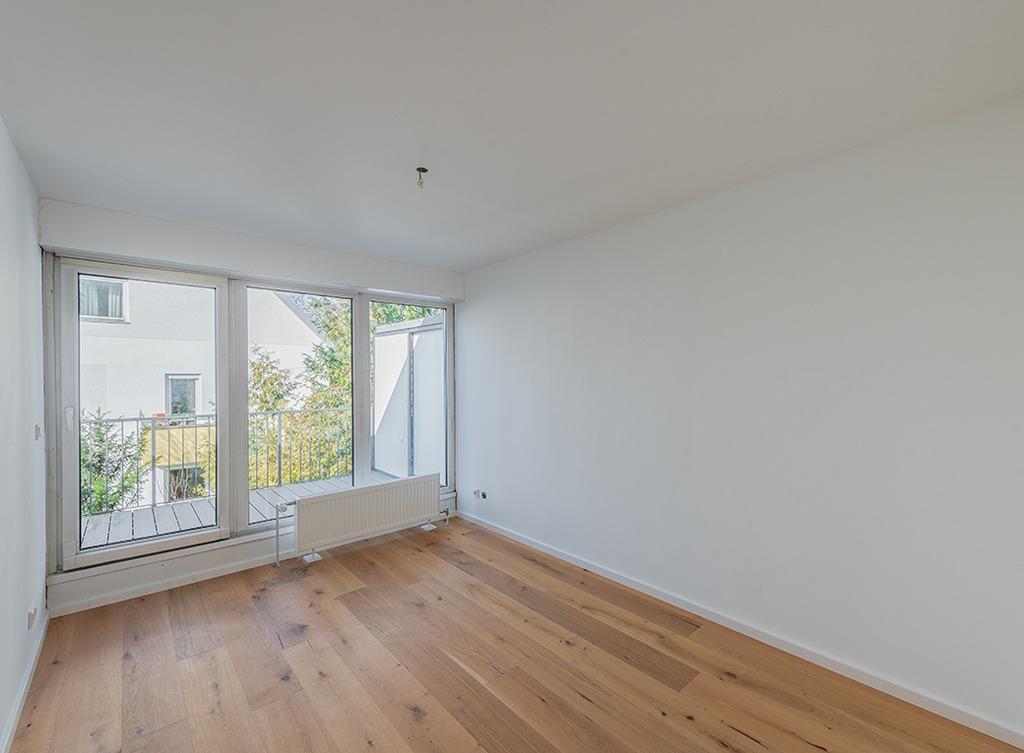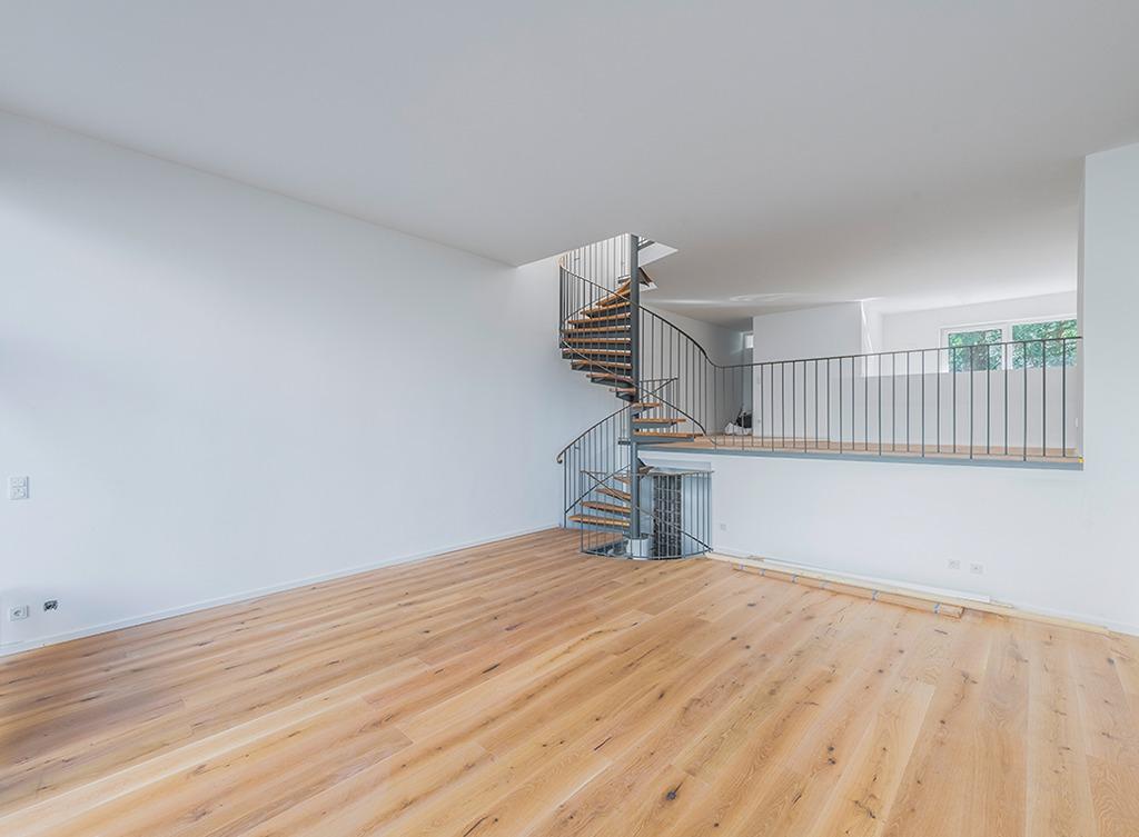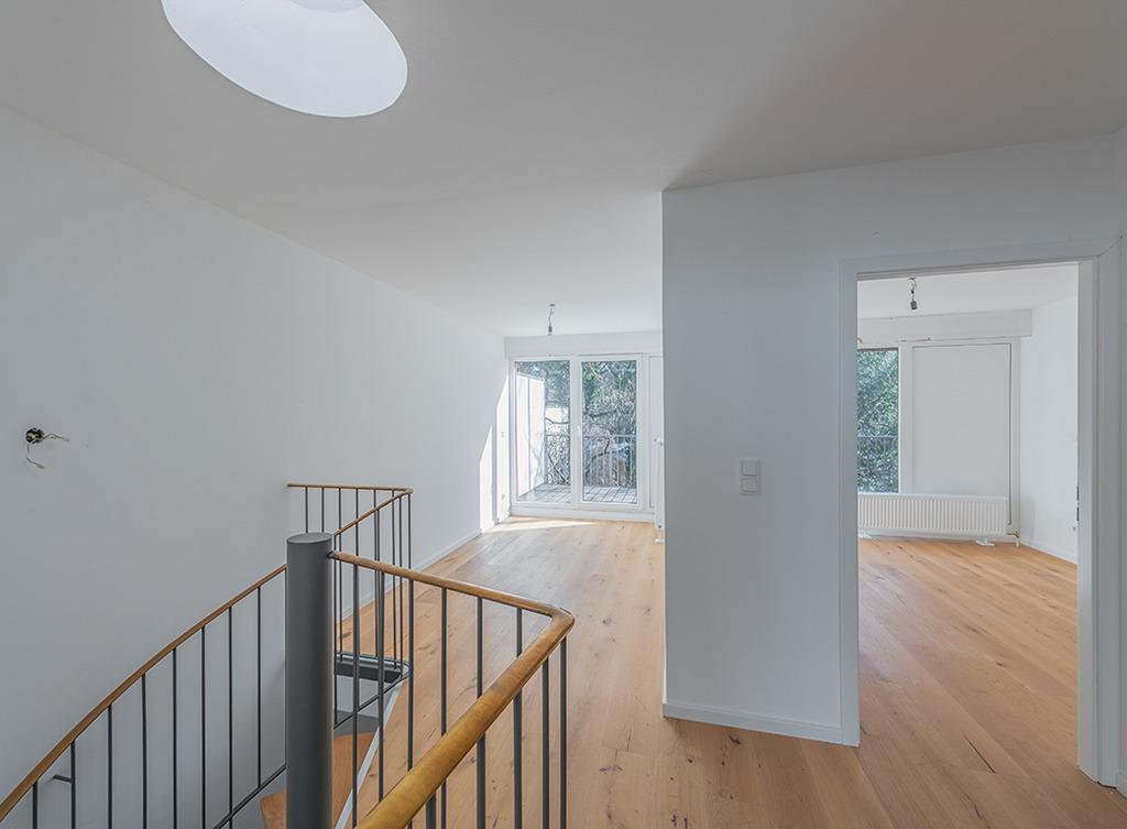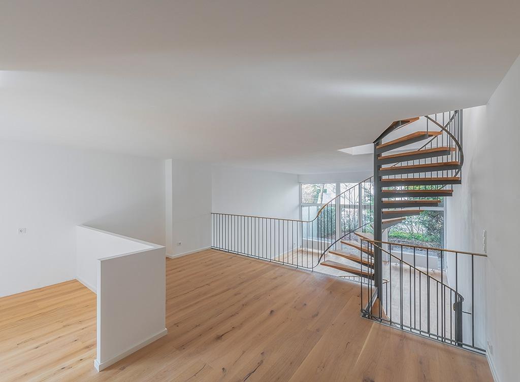 Eine charakteristische Wendeltreppe führt in die zweite Wohnetage, in welcher sich 3 Schlafzimmer, ein offenes Studio (1/2 Zimmer) und das Badezimmer mit elektrischem Fenster befinden. Zwei großzügige Balkone mit West- bzw. Ostausrichtung im ersten Obergeschoss, bodentiefe Fenster und Lichtkuppeln in der Decke ergänzen das Gesamtbild.