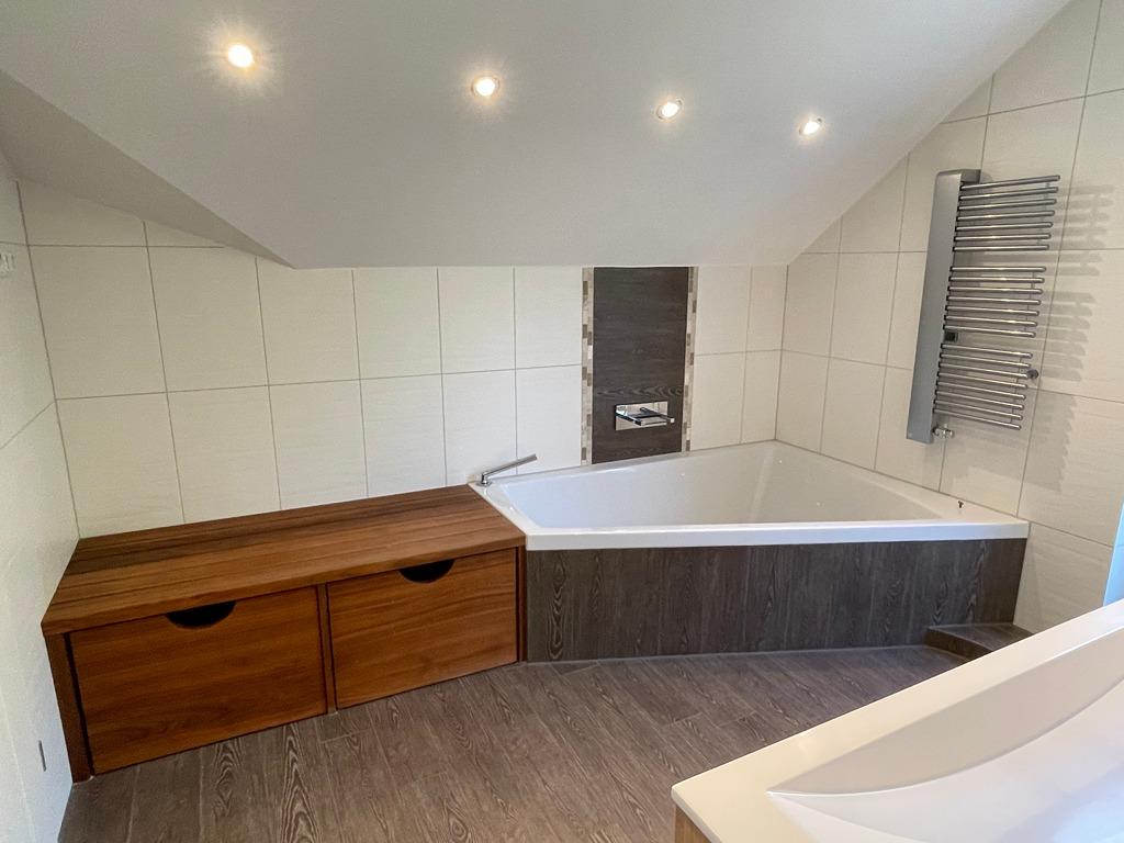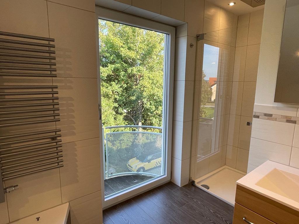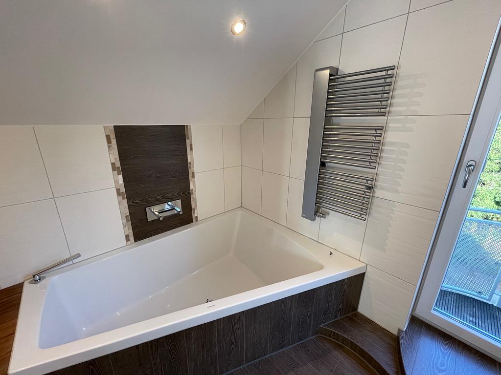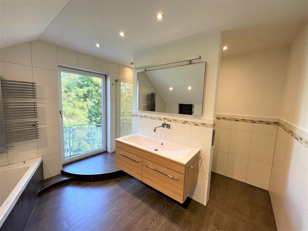 - Großzügiges Bad: Eckbadewanne mit beleuchtetem Wassereinlauf, Regendusche, großzügiger Waschtisch mit Unterschrank und einem beleuchteten, hochwertigem Spiegel, Handtuchheizkörper, Balkontüre.