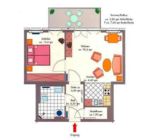 Im Hause befinden sich 47 Wohnungen in den Größen von 44 – 86 m². ausgestattet, mit Terrasse im Erdgeschoss, Balkon oder Loggia. Baujahr 2005